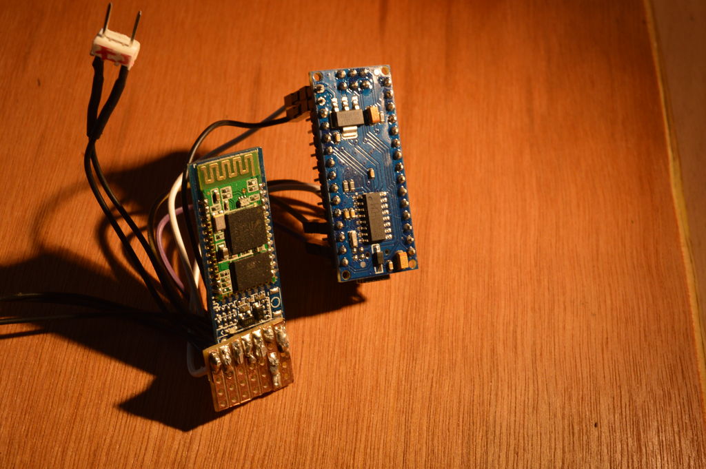 Do zasilenia Arduino i monitorowania napięcia ogniw użyto złącza przeznaczonego do równoległego ładowania ogniw litowo-polimerowych. W zależności od naładowania, napięcie na wejściu arduino wynosi około 7V. Analogowy pin z płytki jest podłączony do jednego ogniwa i jeśli jego napięcie spadnie poniżej 3,5V to użytkownik dostaje informacje o słabej baterii w aplikacji na Androida. W celu elektrycznego połączenia wszystkich modułów użyto małego kawałka płytki prototypowej, co daje relatywnie dobre połączenie i zapewnia w miarę dobry porządek w kablach.