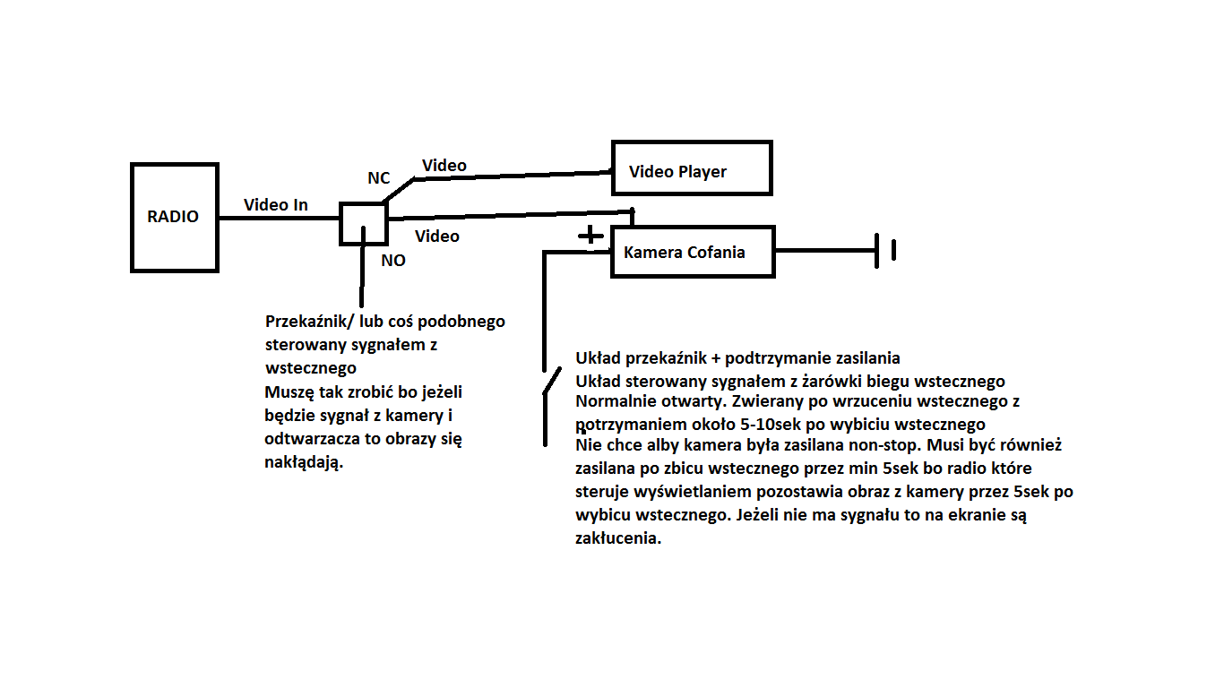 Chcę wykonać układ który będzie zamontowany w samochodzie i będzie włączał i wyłączał zasilanie z kamery cofania. W chwili obecnej kamera cofania działa non stop i strasznie się grzeje. Układ nie może być zwykłym przekaźnikiem bo musi podtrzymywać pracą kamery przez 5sek po wyłączeniu jej zasilania. Jest to spowodowane tym że radio utrzymuję otwarte video in jeszcze przez 5 sek po zbiciu wstecznego i jeżeli kamera nie daje obrazu to wtedy sieje na ekranie co jest irytujące.