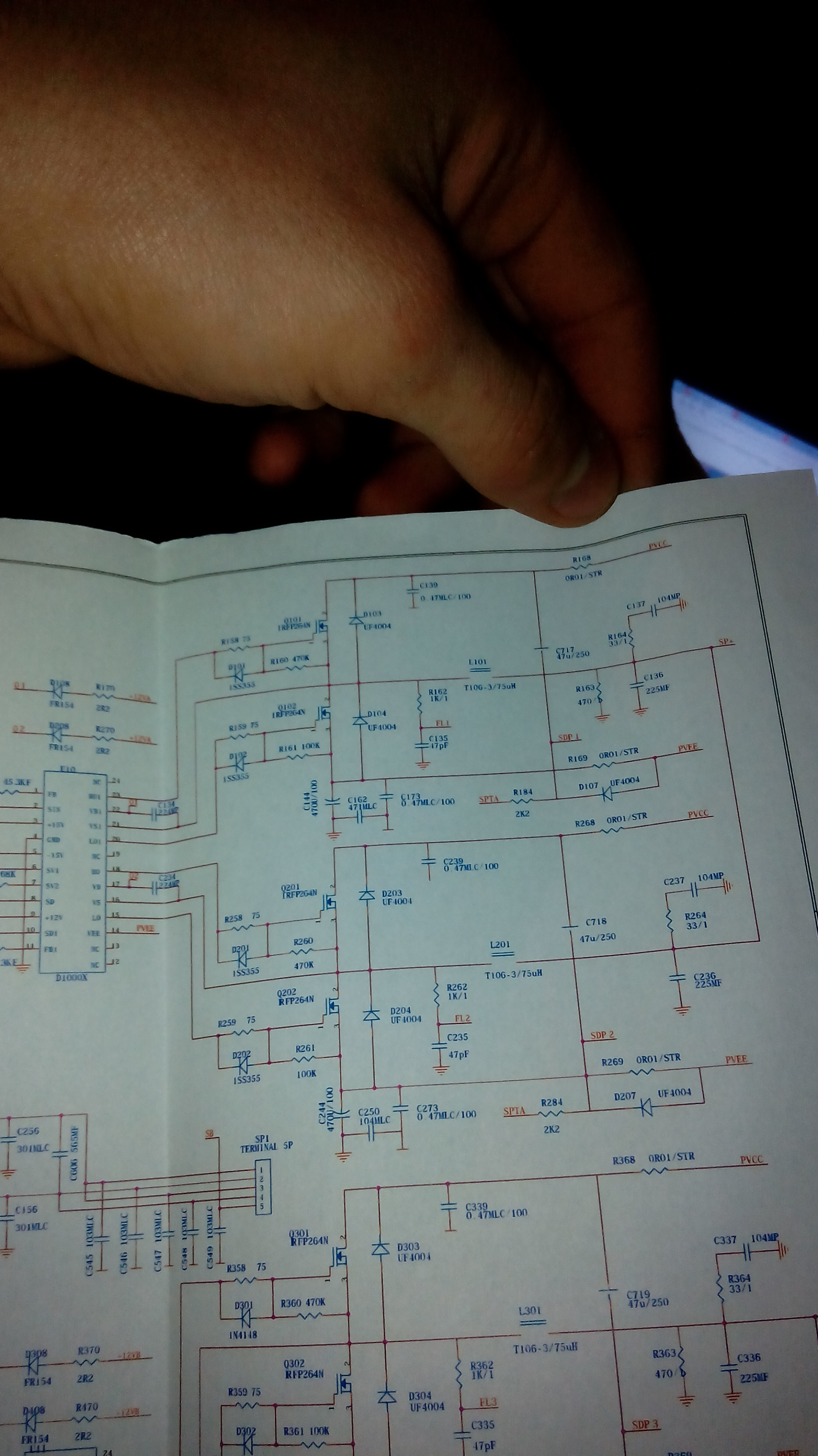 Na niebiesko zaznaczone plytki, czerowny tranzystor prostowniczy, fiolet kondensator
