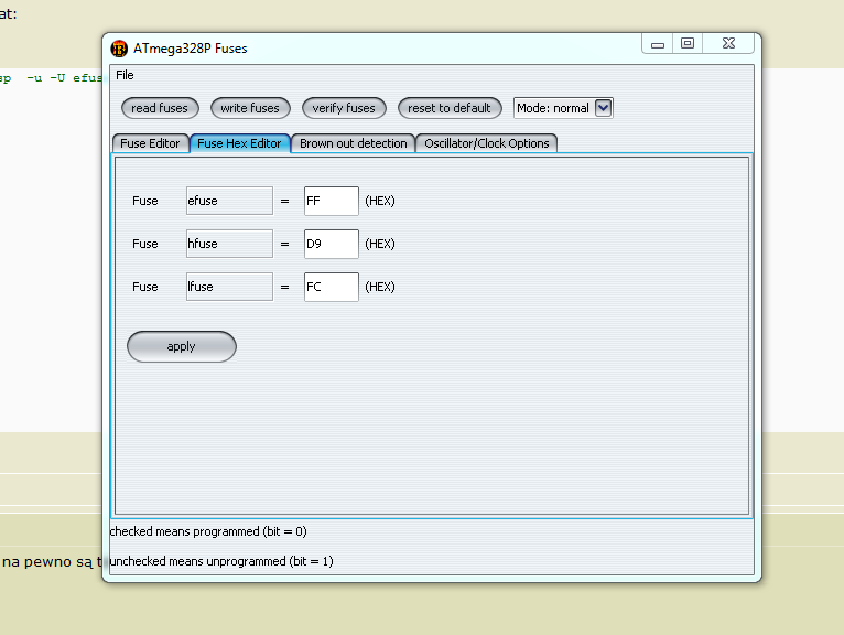 Nie mogę zaprogramować fusebitów dla procesora ATMEGA328p.