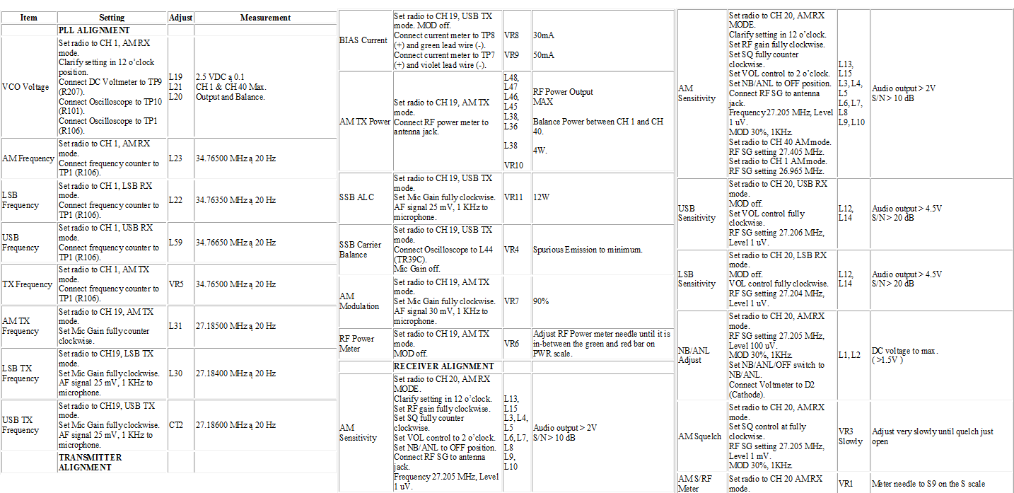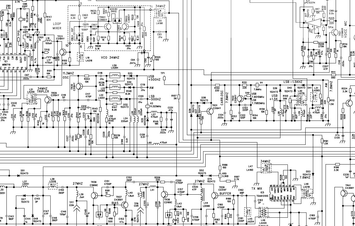 Na dobry początek masz "rozjechane BFO" sądząc po podanych f. i to ustaw jak pisałem. Inaczej filtr kwarcowy nie spełnia swego zadania i całe radio robi się "szumofonem". Generalnie W LSB ma być niżej od 7,8 MHz o 1,5 KHz, a w USB wyżej. Wynika to jednoznacznie z tabeli którą zamieściłeś ponieważ dla LSB częstotliwość VCO pierwszego kanału wynosi 34,76350 MHz, więc wystarczy obliczyć 34,76350-7,79850=26,965 MHz.