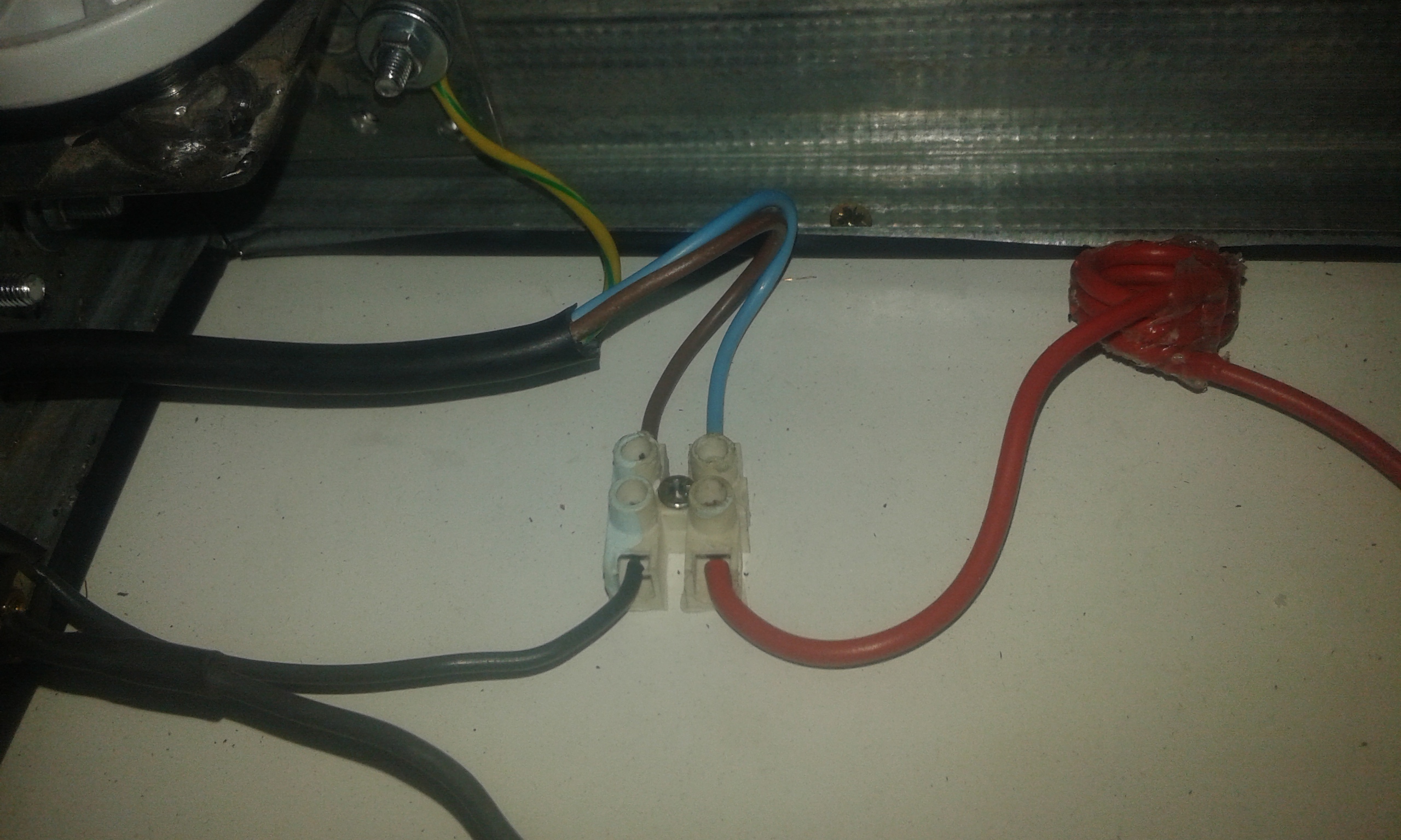 • W otworze w blacie roboczym została umieszczona śruba fi8, w której wywierciłem otwór o średnicy 5mm. Całość przykręciłem do blatu od spodu. Do śruby tej doprowadzone jest napięcie. Ma to na celu zapobiec ewentualnemu wychładzaniu się drutu oporowego przy kontakcie z tą śrubą (gdyby jej nie było, mógłby się wychładzać od kontaktu z drewnem). Tym samym drut oporowy zasilany może być w tej części w dwóch miejscach (na uchwycie oraz z tej śruby). Udało mi się tak wycentrować drut oporowy w środku tej śruby, że nie styka się z jej ściankami.