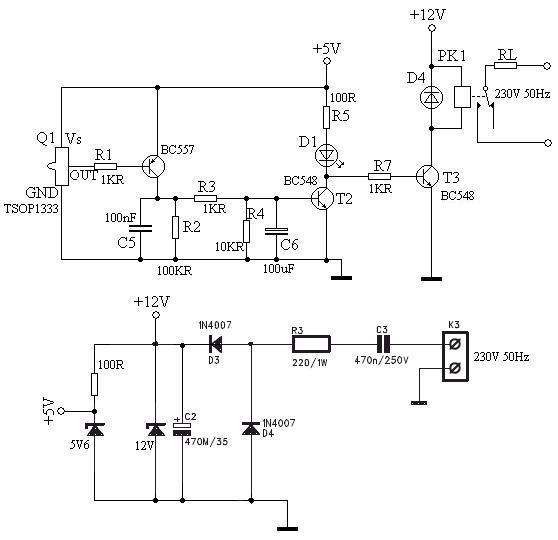 Prosty tester transmisji podczerwonej zasilany wprost z sieci 230V/50Hz. Dioda zenera 5,6V ogranicza napięcie. Można zastosować dowolną diodę odbiorczą z wyprowadzeniem na zasilanie. Wskaźnikiem jest LED oraz buzzer.