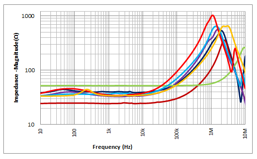 Rys. 1: Amplituda impedancji w funkcji częstotliwości dla kilku modeli słuchawek.