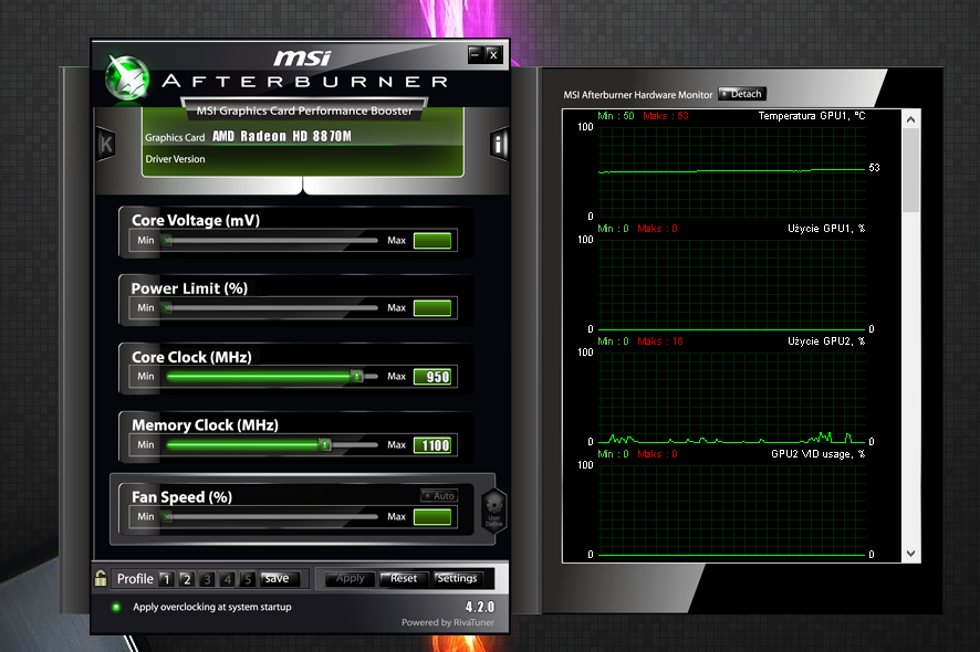 Zastanawia mnie pewien fakt czy można delikatnie (nie jakoś ekstremalnie) zwiększyć taktowanie karty graficznej amd radeon 8870m HD. (Wiem ,że trzeba monitorować temperatury i oriętuję się trochę jakie są bezpieczne temperatury a jakie niezbyt i temperatury mam bardzo niskie jak na laptopa bo przy obciążeniu 60°C/65°C)