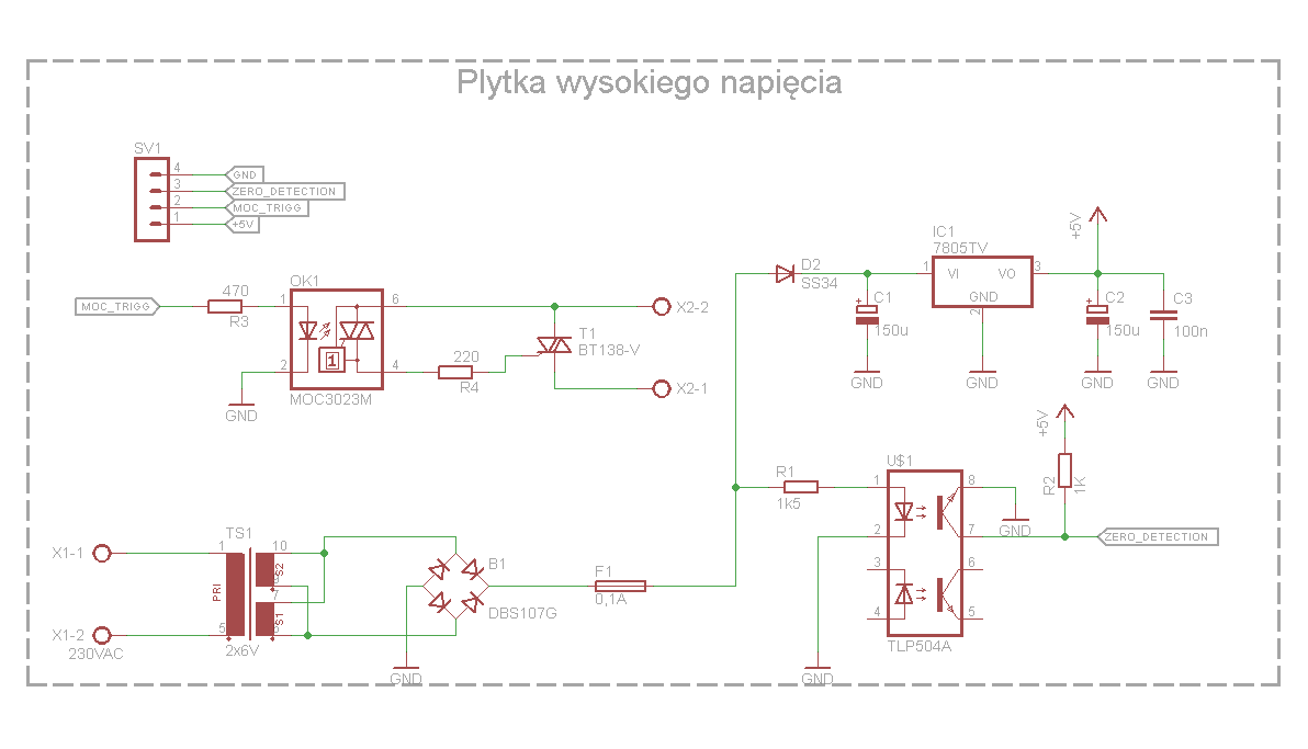 Działa to, ale niestabilnie. Powyżej poboru 80w mocy przez żarówkę, po kilku minutach słychać jakieś trzaski jakby iskrzenie styków i w końcu żarówka gaśnie. Po chwili jak znów ją włączę to to samo. Gdy w programie wyjście uC które jest połączone z moc po prostu włączę na stałe, to żarówka świeci pełną jasnością, ale po kilku minutach sytuacja się powtarza. Gdy podam na moc 5V zworką z L7805 to też podobnie, jednak świeciła żarówka 10 min i tylko trzeszczało trochę, ale nie zgasła.