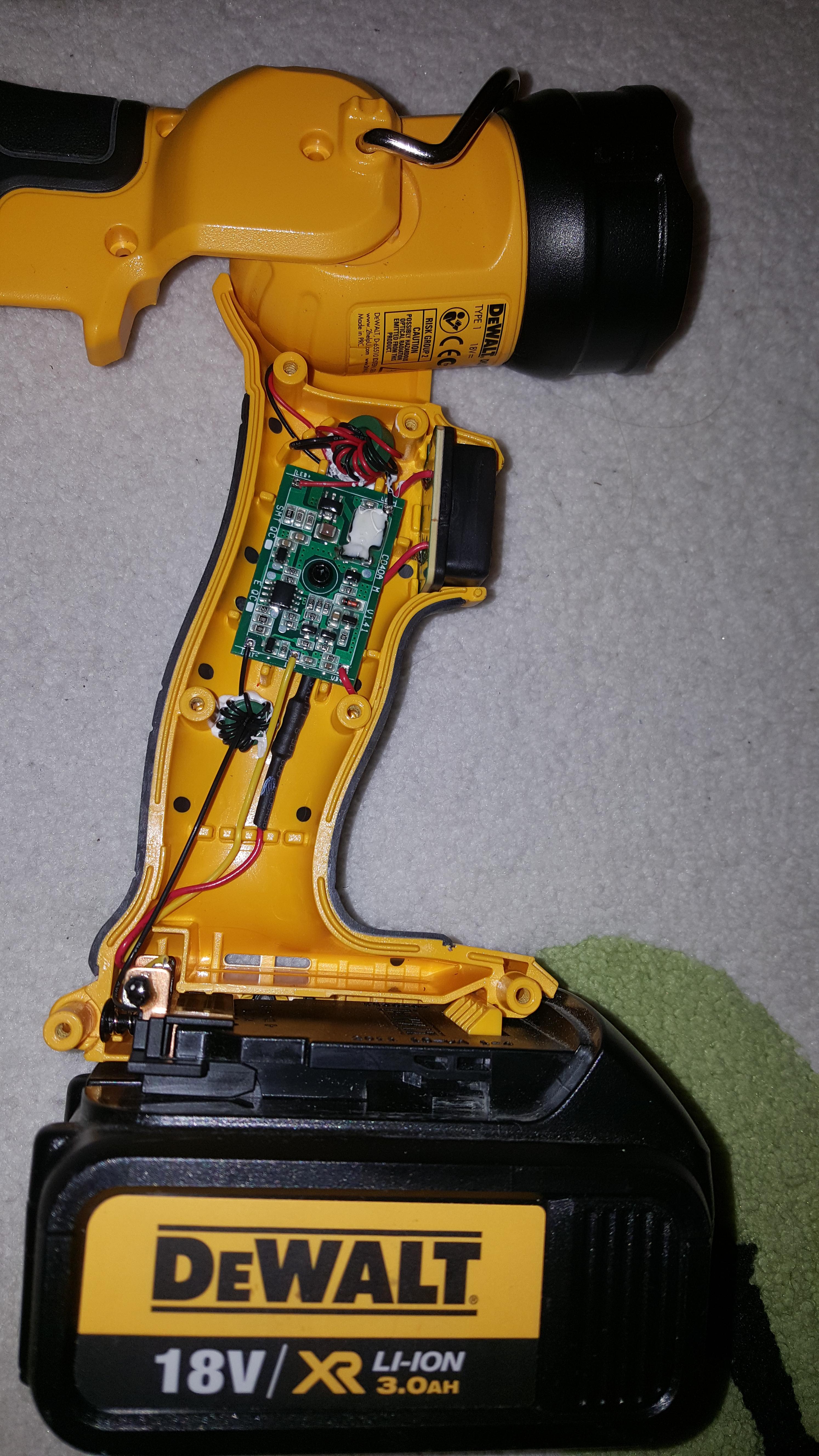 Mam problem z latarka LED firmy DeWalt. Zakupilem ja w zestawie z wiertarka bezprzewodowa. Zasilana jest bateriami 18v z wiertarki. Baterie na pewno dzialaja bez zarzutu, bo sprawdzone byly na wiertarce.