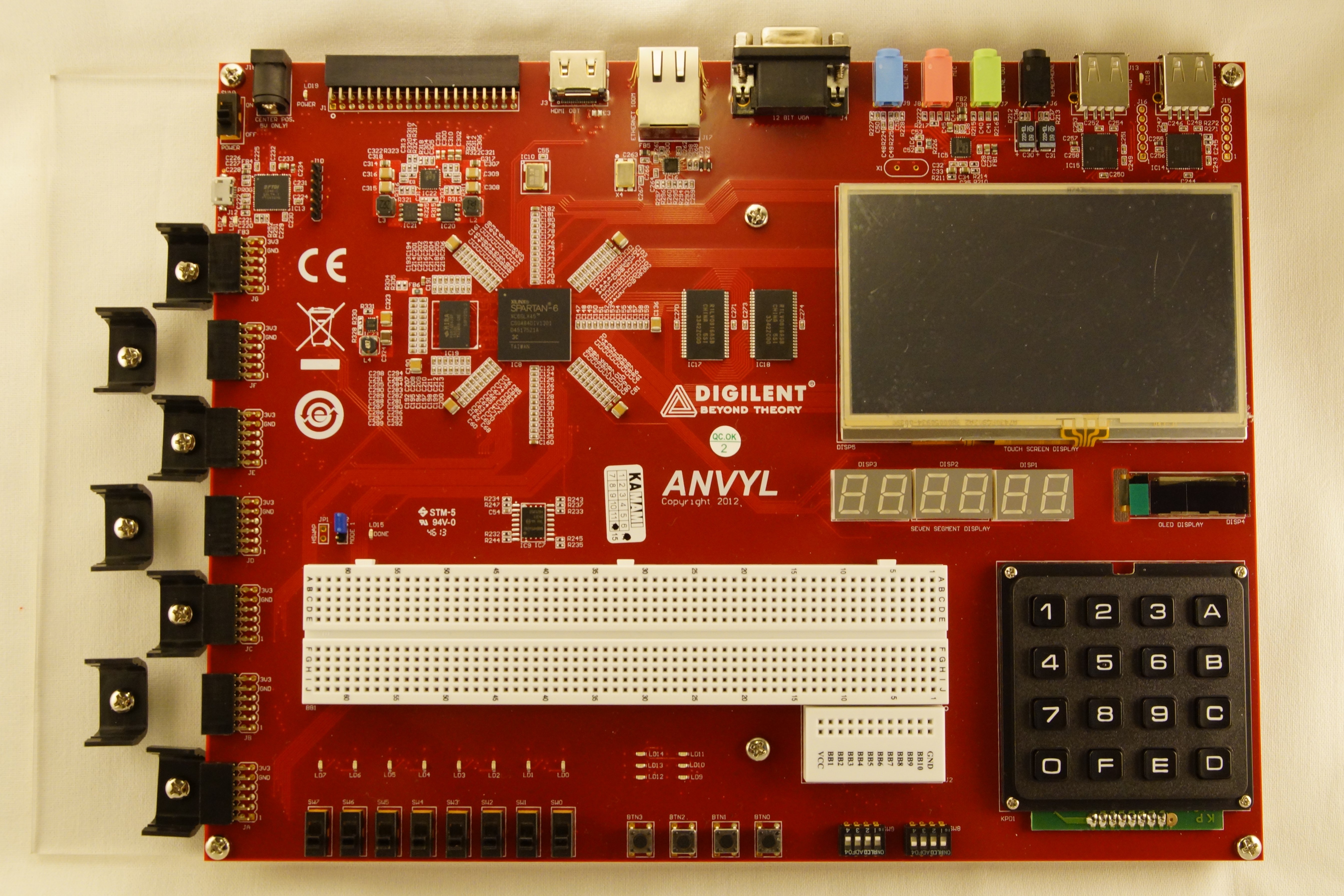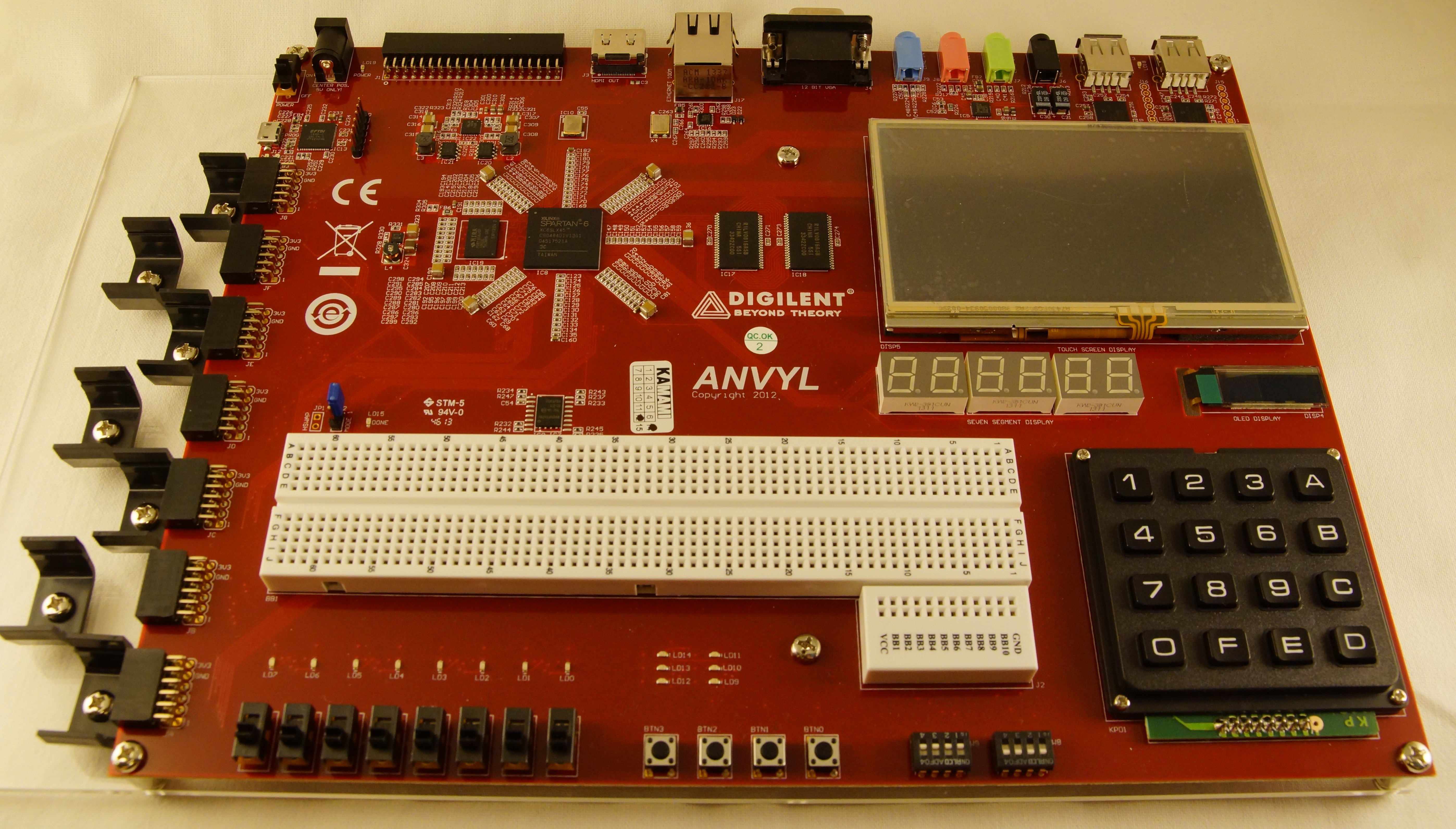 The Anvyl™ FPGA development platform is a complete, ready-to-use digital circuit development platform based on a speed grade -3 Xilinx® Spartan®-6 LX45 FPGA. The large FPGA, along with the 100-mbps Ethernet, HDMI Video, 128MB DDR2 memory, 4.3” LED backlit LCD touchscreen, 128x32 pixel OLED display, 630 tie-point breadboard, multiple USB HID controllers, and I2S audio codec makes the Anvyl an ideal platform for an FPGA learning station capable of supporting embedded processor designs based on Xilinx's MicroBlaze™.