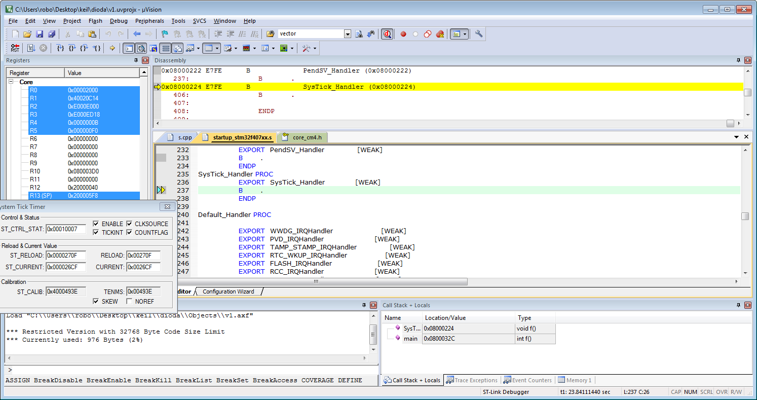 Kod chyba prostszy być nie może, włączam zegar na portd, wyjście i zapalam diodę. Problemem jest to, że ten systick po sekundzie zamiast wywołać funkcję SysTick_Handler on zawiesza procesor. Po wejściu w pętlę nieskończoną stan systick: