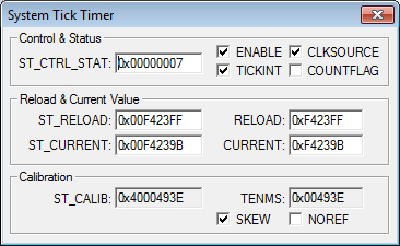 Wg datasheeta przerwanie to powinno mieć adres 0x0000003C. Czyli chyba wektor działa i wiesza się gdzieś dalej (lub wywołuje się wyjątek o braku uchwytu dla przerwania ?) (bo adres nie jest równy z tym z wektora dla systicka w procesorze ??)