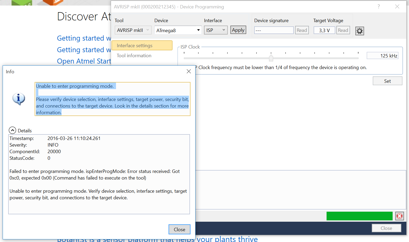 Posiadam taki programator. Mam z nim mały problem, ponieważ wg dokumentacji producenta, po podłączeniu programatora powinna świecić dioda zielona, a w moim przypadku ciągle świeci dioda czerwona. Niezależnie czy podłączę atmegę czy też nie. Oczywiście atmegi też wykryć nie jest wstanie ponieważ środowisko atmel wypluwa mi taki komunikat: