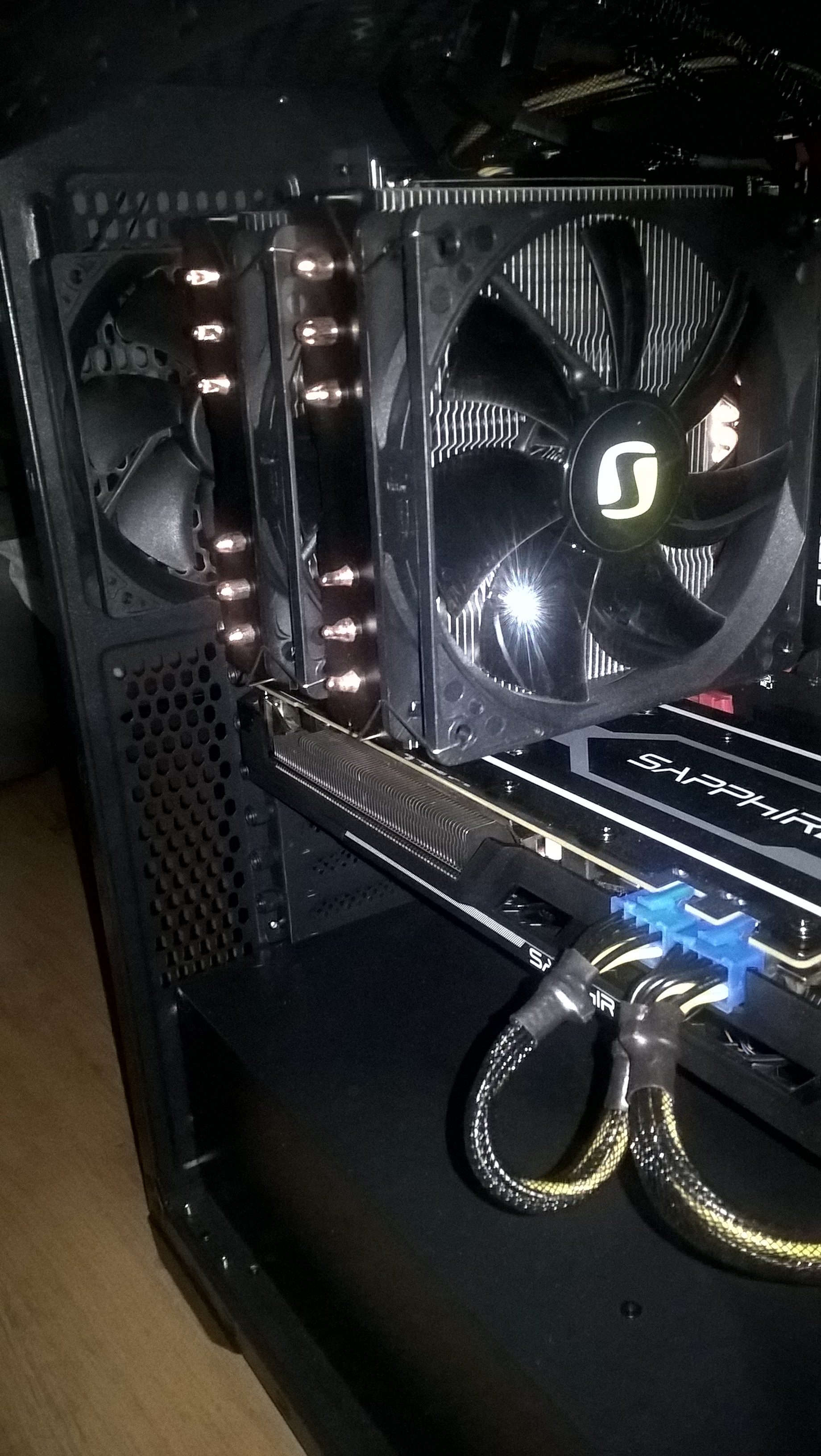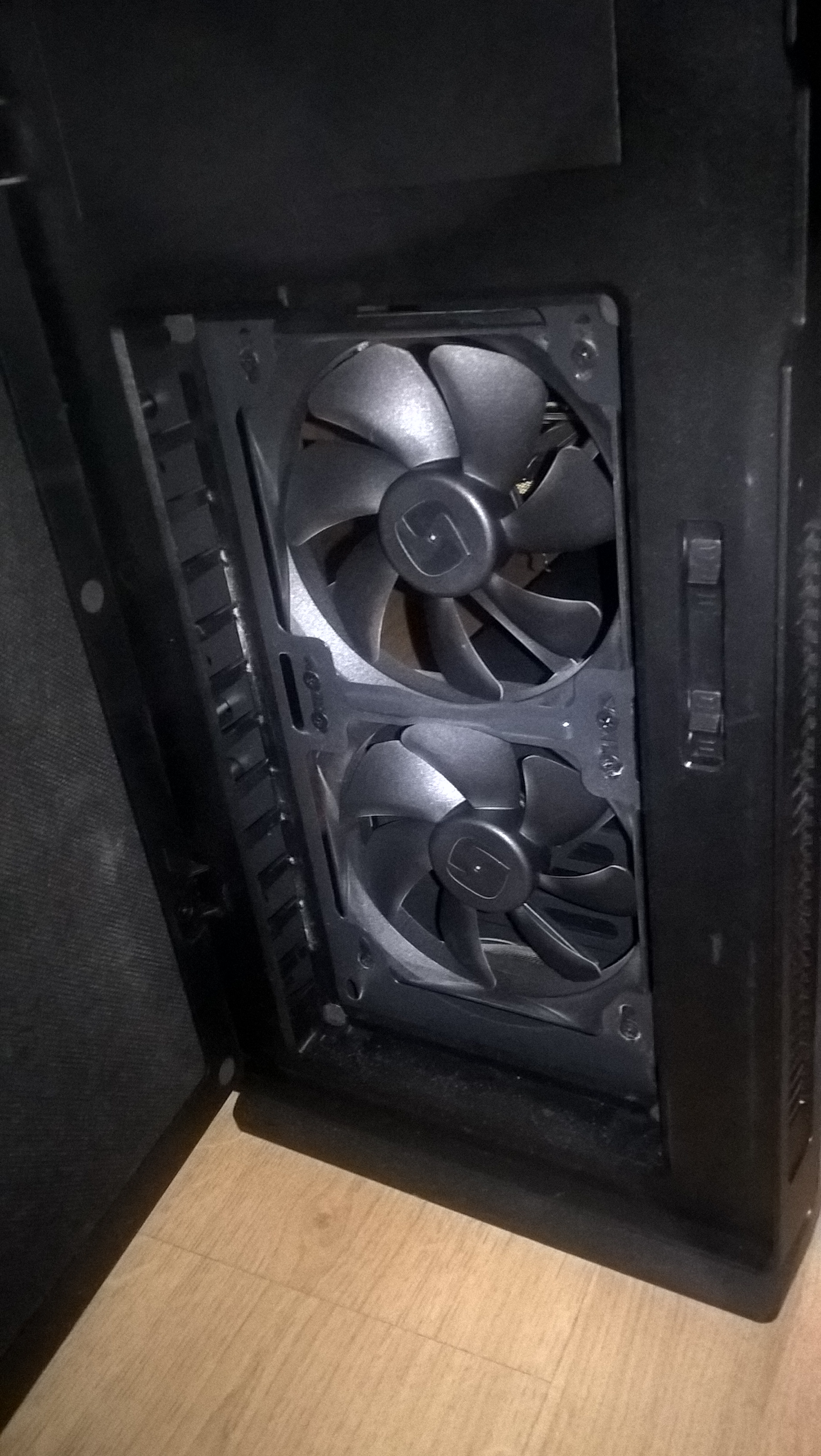 2wiatraki wentylatory na froncie wtłaczające powietrze ( jeden bezpośrednio na kartę graficzna, drugi po części na kartę wraz z pierwszym ale w większości na dolny panel ( zasilacz + dysk HDD ). 1 wiatrak wentylator na tyle obudowy wyciągający powietrze bezpośrednio z radiatora ustawionego 5 cm od wiatrakawentylatora. Radiator sam w sobie ma 2 wiatraki wentylatory jak widać w zestawie + 3 karty graficznej działające same dla siebie ( chłodzenie pół pasywne jednak często 2 albo 3 są uruchomione na raz)