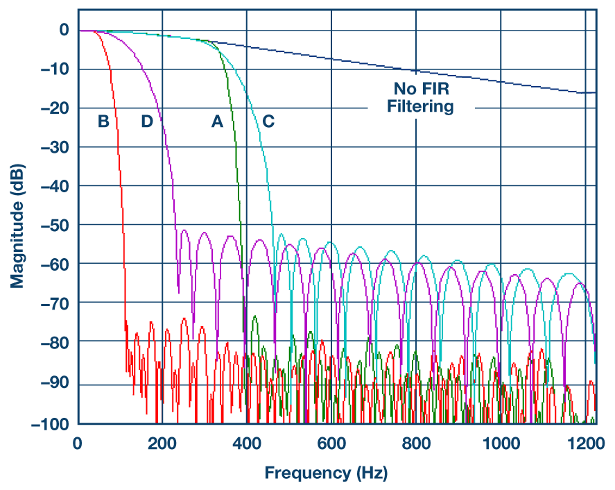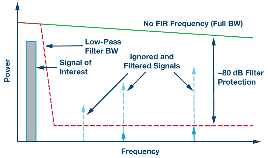 Filtr FIR jest najbardziej przydatny, gdy do analizy nie potrzebujemy pełnego pasma filtru. Zamiast tego analizujemy jedynie wąskie pasmo poniżej częstotliwości odcięcia filtra, a sygnały o wyższej częstotliwości są odfiltrowane. Na przykład w naszym systemie interesuje nas jedynie ruch i rotacja o częstotliwości pomiędzy 20 Hz a 50 Hz. Jeśli IMU poddawane jest ruchowi z wyższą częstotliwością, lub w sygnale występuje szum o wyższych częstotliwościach niż 50 Hz, jeśli wykorzystamy decymujący filtr FIR to sygnały te i szum nie zakłócą naszego pomiaru. Na rysunku 1 zaprezentowano metodę stosowania filtrów opisywanego rodzaju do stworzenia filtra dolnoprzepustowego i tłumienia pasma o czynnik 16.