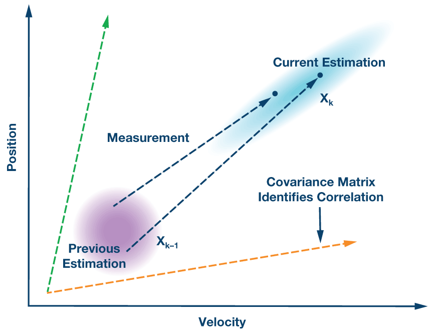 Każde k-ty krok możemy traktować jako identyfikację pozycji w dyskretnym czasie, związanym z poszczególnymi próbkami pochodzącymi z poszczególnych osi sensora w IMU. Aktualna estymacja pozycji oparta jest na estymacji pozycji z k-1-tego kroku zmieniona o odczyt z sensora z odpowiednim wzmocnieniem Kalmana, które zależne jest od systemu i czynników środowiskowych. Wstępne wzmocnienie lub kowariancja filtra zapisywane są w ustawieniach sensora, aby oszacować spodziewaną korelację pomiędzy wektorami wyjściowymi sensorów. Optymalne wartości kowariancji dla danego IMU zależą od różnych czynników, dlatego też ich ustalenie wymaga wielu iteracji - obserwowania układu, analizy zachowania i poprawiania wartości tego parametru w czasie kalibracji filtra.