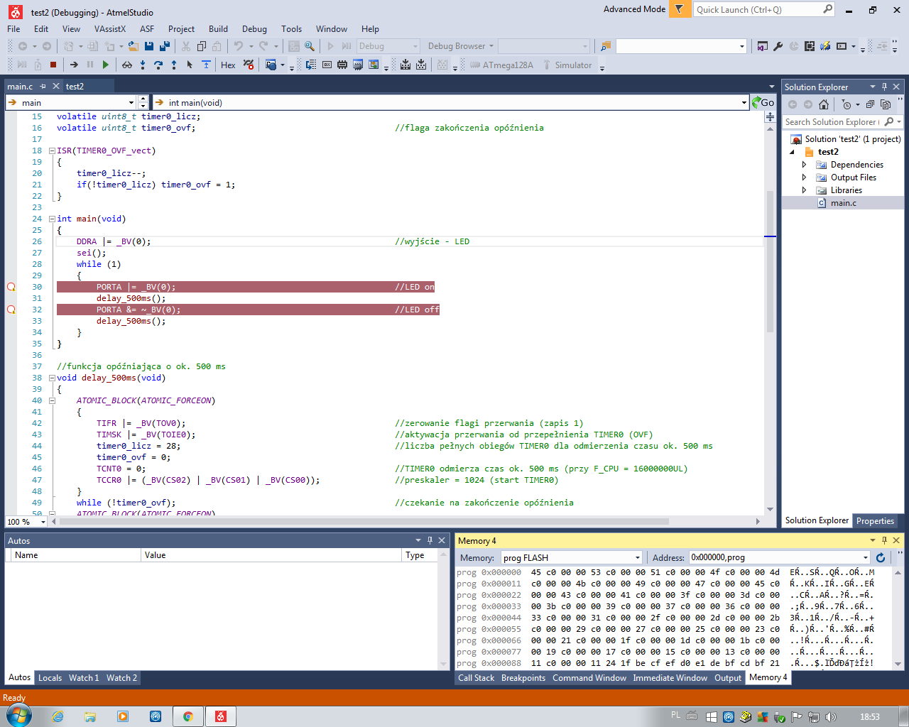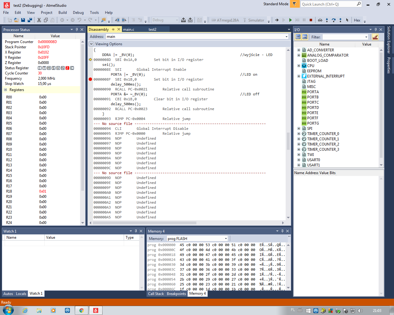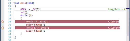 Witam. Używam AS6.2.1563 SP2 oraz AS7.0.943. Mam problem z ustawieniem breakpoint'ów w kodzie źródłowym w różnych projektach. Po włączeniu debugowania w symulatorze jak i z użyciem debugera JTAGICE3 próba ustawienia breakpointa zawsze kończy się komunikatem: "The breakpoint will not currently be hit. Unable to set requestet breakpoint on target. Note: The current selected device is unable to set breakpoint during runtime." Zmiana w symulatorze typu mikrokontrolera nic nie dała. Próbowałem zmieniać poziom optymalizacji na -O0 i poziom debugowania na -g3 - bez skutku. Próbowałem również ustawić poziom optymalizacji na -Og - również nic to nie dało. Zauważyłem, że mogę bez problemu ustawić breakpoint'y w kodzie asemblerowym.