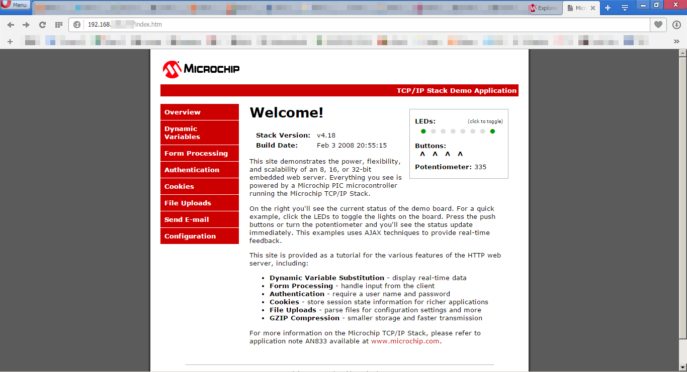Aktualnie wgrany program to demo testowe stosu TCP/IP Microchipa - wyniki działania widoczne na zdjęciach i screenie z przeglądarki (serwer WWW, z obsługą LED, Buttonów i potencjometru). Oryginalny program na pewno jest zmodyfikowany (np jeden z LEDów świeci się słabiej - najprawdopodobniej sprawdzany był PWM).