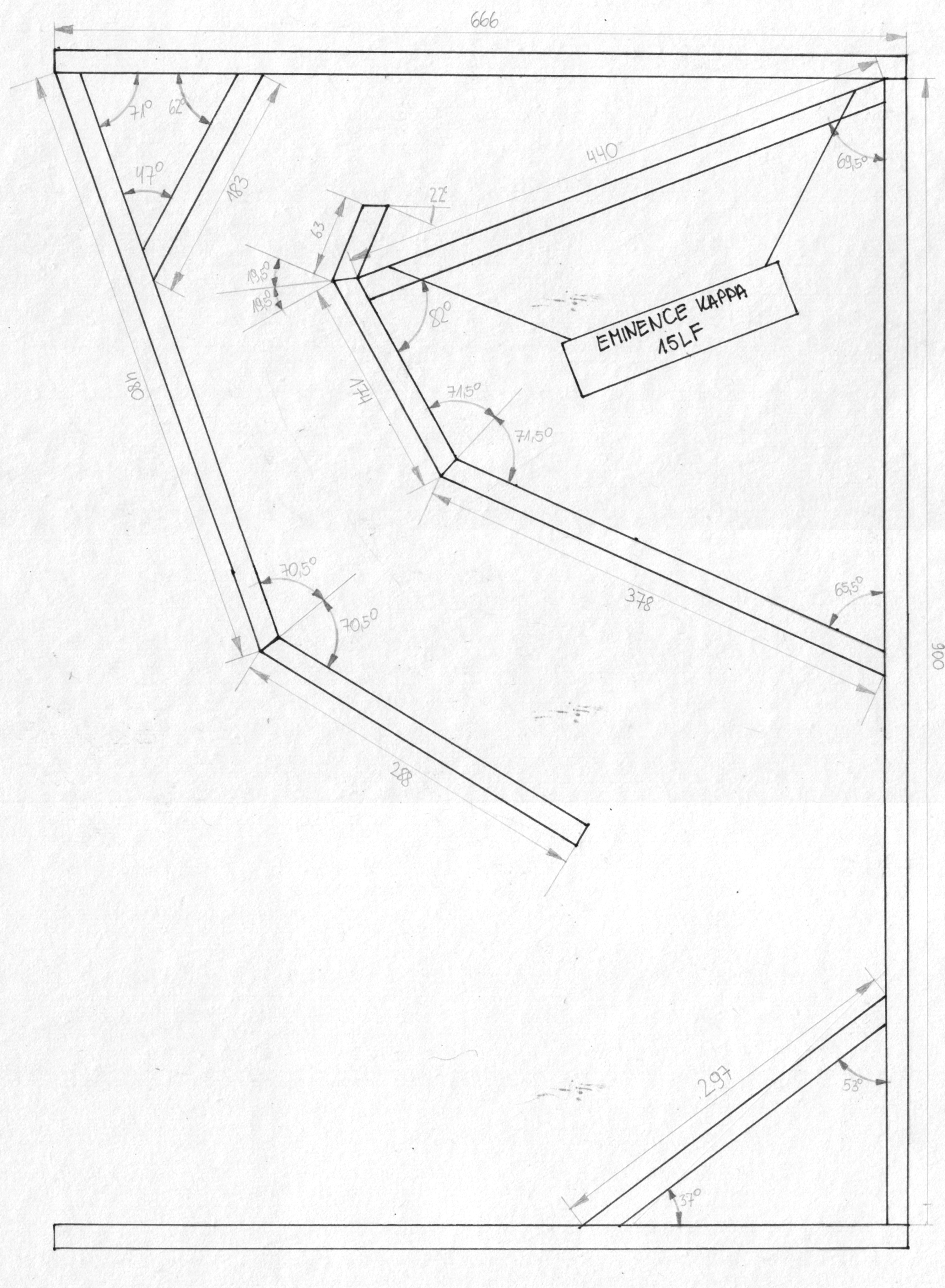 Na prosbe kilku kolegow z forum, postanowilem zamiescic wykonany przeze mnie projekt (jeszcze nie sprawdzony w praktyce!) tuby estradowej na glosniku Eminence Kappa 15LF. Mysle, ze projekt jest chociaz troche godny uwagi ze wzgledu na dobre zejscie przy takich wymiarach. Paczka (zaznaczam - powinna) teoretycznie moze uzyskac 45Hz, a jej objetosc to 396,5 litra. Głębokosc konstrukcji - 60cm netto. Calosc przypomina tuby 186 i 1850, no coz - tej nie dalo sie inaczej narysowac... Aha calosc jest zaprojektowana dla ustawienia w narozniku!