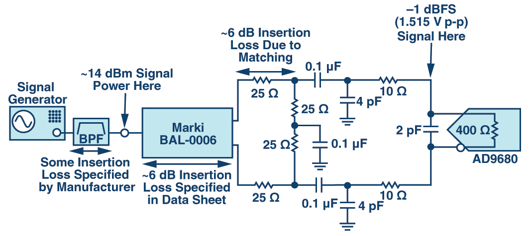 Układ dopasowujący wraz z terminatorami wnosi straty na poziomie 6 dB, więc napięcie międzyszczytowe na każdej z nóżek baluna powinno wynosić dwukrotność wyznaczonego powyżej napięcia 1,515 Vp-p (6 dB to czterokrotne zmniejszenie amplitudy, ale z uwagi na fakt, że sygnał jest symetryczny napięcie na ADC będzie dwukrotnością napięcia na każdej z linii). Daje to około 3,03 Vp-p na każdym z wyjść baluna. Oznacza to, że generator dostarczyć musi sygnał (asymetryczny) o napięciu międzyszczytowym równym również 3,03 Vp-p, co przekłada się na 14 dBm. Pamiętajmy, że powyższe obliczenia nie uwzględniają strat na samym balunie, które zależne są od konkretnego elementu oraz strat na filtrze pasmowym, jaki oddziela balun od generatora.