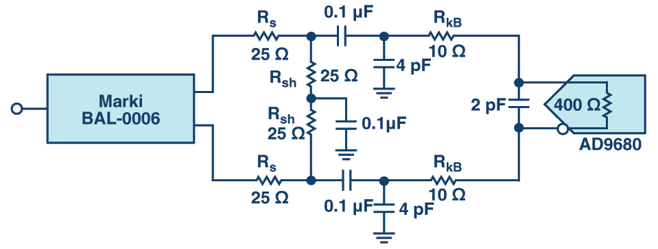 Konwersja sygnału z linii asymetrycznej do symetrycznej zrealizowana została na szerokopasmowym balunie BAL-0006SMG. Wystarczy krótkie spojrzenie w kartę katalogową tego elementu, aby spostrzec, że straty na tym balunie wynoszą 6 dB. Idąc dalej - układ dopasowujący, znajdujący się za balunem, zestawiony z oporników Rs i RSH dodaje kolejne 6 dB straty w sygnale. Tego rodzaju układ dopasowujący jest wymagany, aby dopasować szerokopasmowe wyjście z baluna do wejścia przetwornika analogowo-cyfrowego. Dodatkowo, opornik wpięty równolegle w sygnał wejściowy do ADC (RkB) dodaje dalsze straty do sygnału, ale z kolei usuwa z widma sygnału trzecią harmoniczną, która pojawia się na skutek odbijania się ładunku z układu próbkującego (sample-and-hold) na wejściu przetwornika.