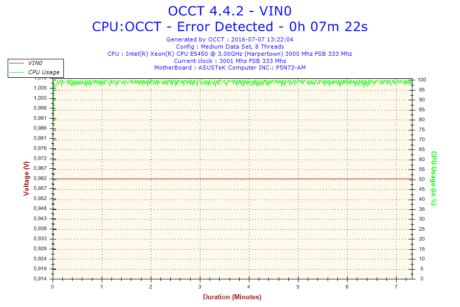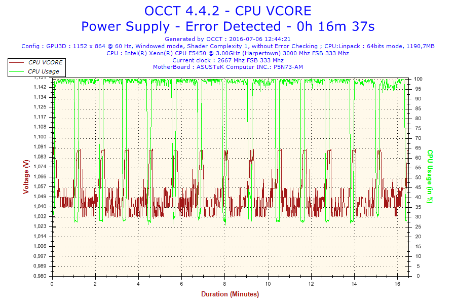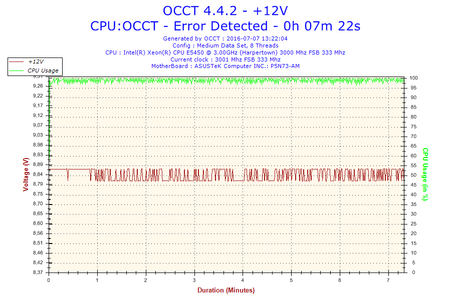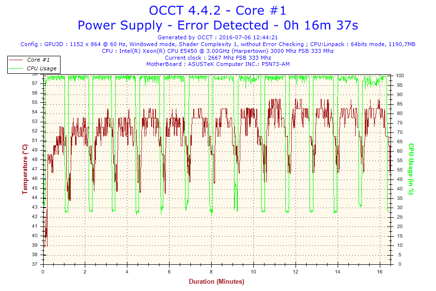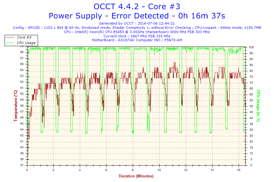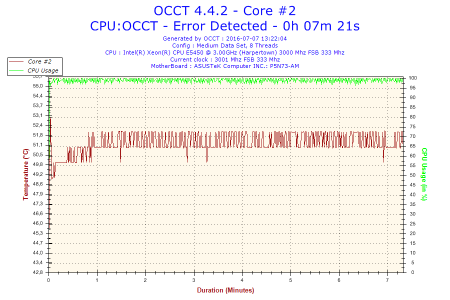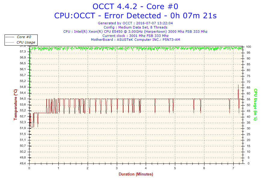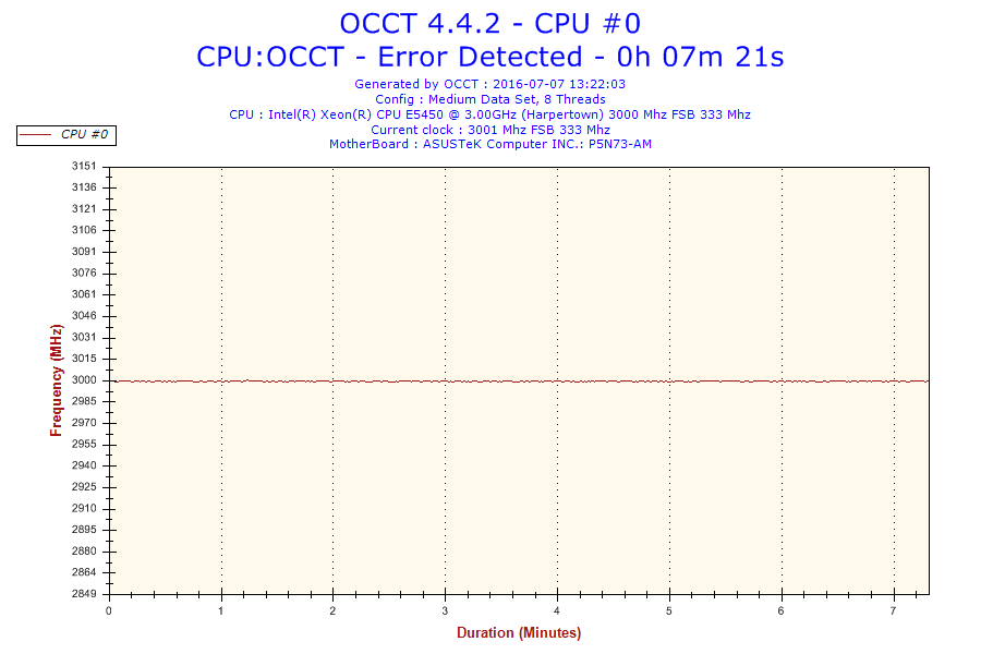 Problem jest taki że normalnie ten procesor jest taktowany na 3.0 GHz. Po ustawieniu BIOS-u na domyślne, procesor ma mnożnik 6 i FSB 333 co daje 2.0 GHz. Gdy go testowałem na mnożniku 8 po 16 minutach wywaliło mi błąd w OCCT. Screeny poniżej. (reszta w podpoście)
