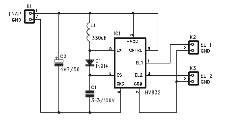 HV832 jest sterownikami zaprojektowanymi do zasilania dwóch lamp EL o łącznej powierzchni do 3,5 cala kwadratowego. Napięcie zasilania 2.0 do 3.6V. W układzie tym zminimalizowano szumy generowane przez lampę. Układ wykorzystuje pojedynczy element indukcyjny oraz kilka elementów pasywnych. Nominalne napięcie wyjściowe dla lampy EL wynosi ±80V.