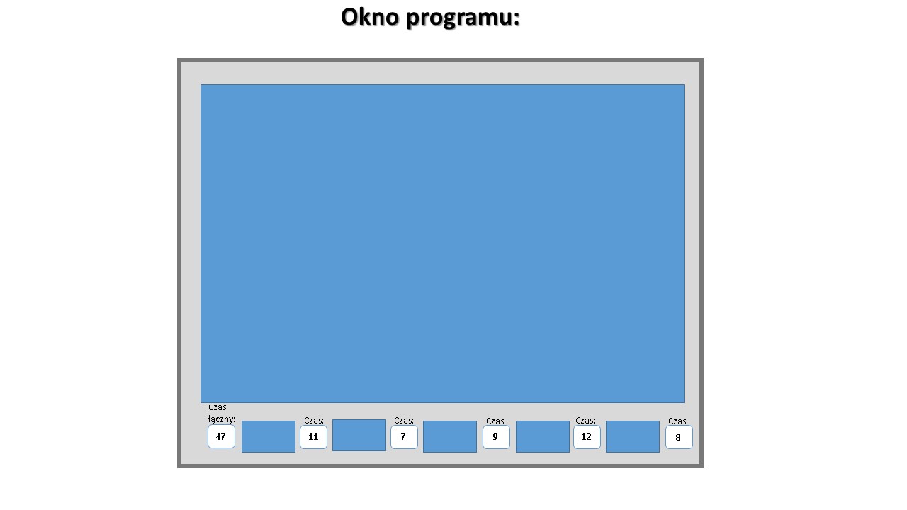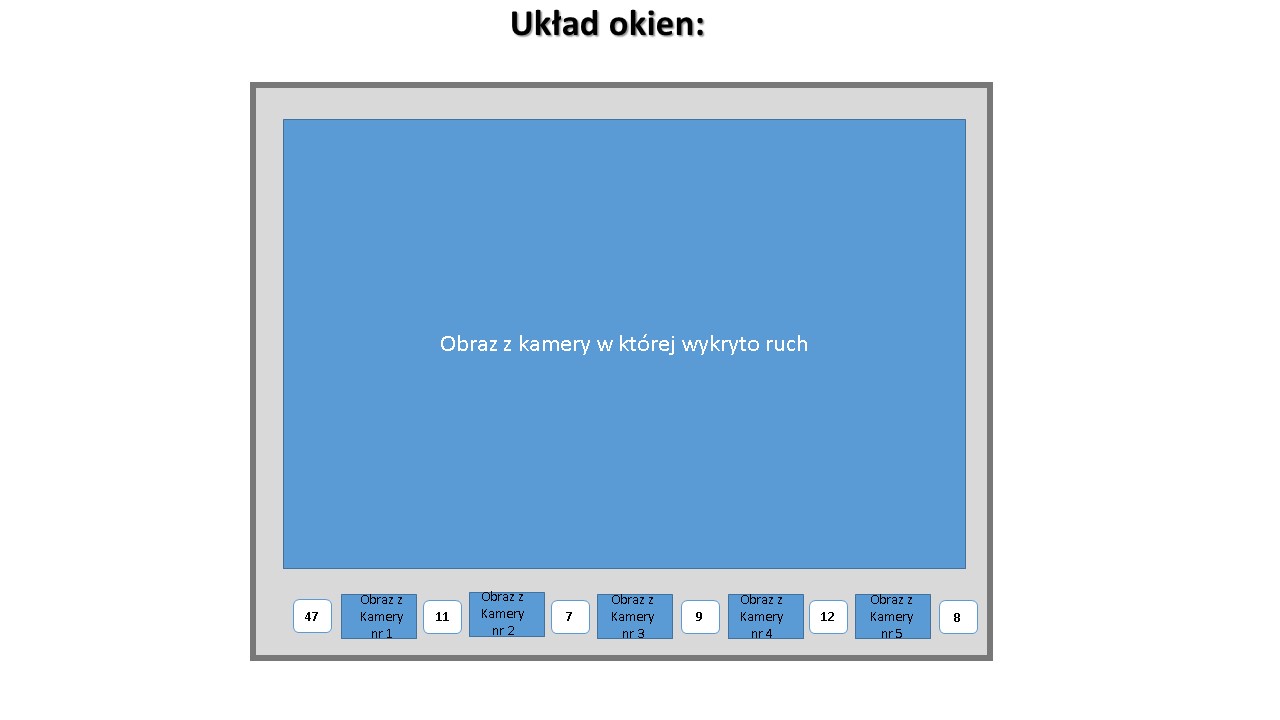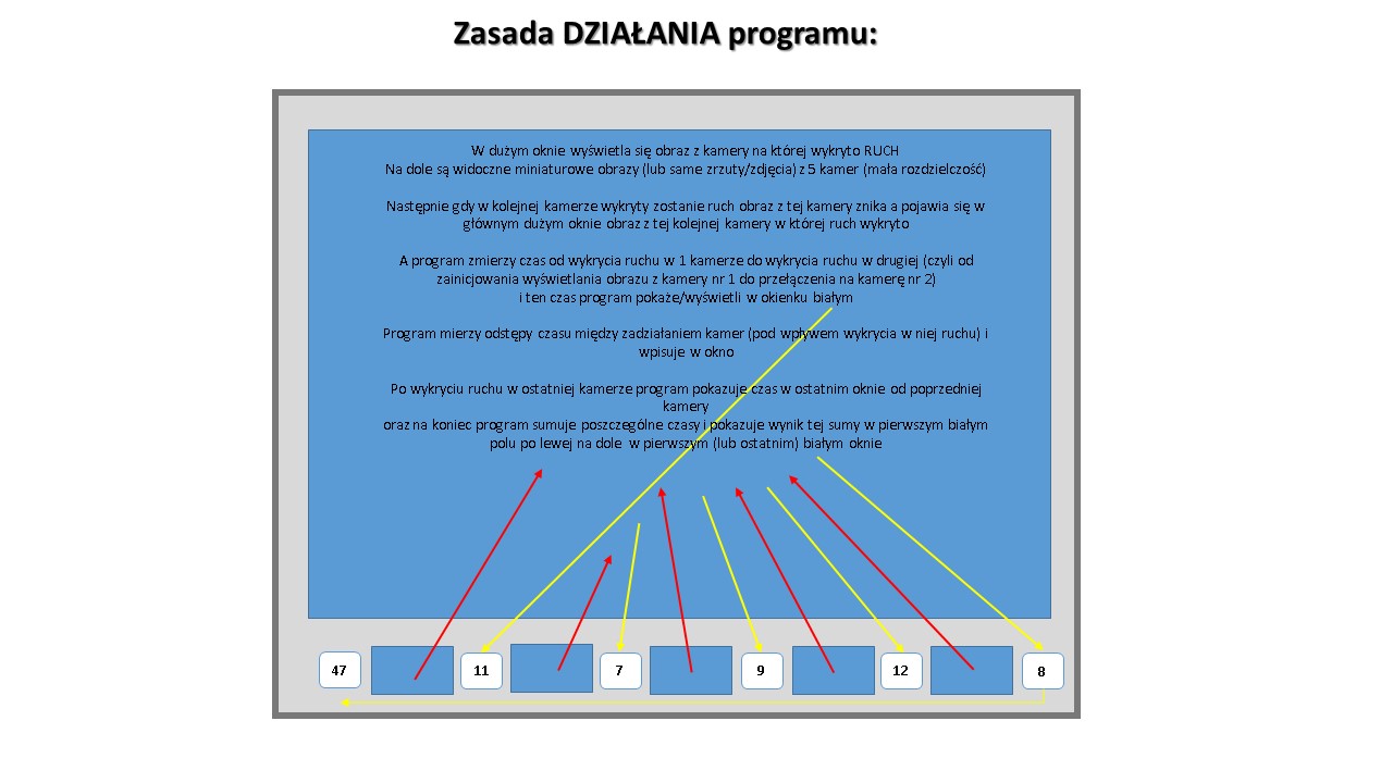 Na dole są widoczne miniaturowe obrazy (lub same zrzuty/zdjęcia) z 5 kamer (mała rozdzielczość). Następnie gdy w kolejnej kamerze wykryty zostanie ruch obraz z tej kamery znika a pojawia się w głównym dużym oknie obraz z tej kolejnej kamery w której ruch wykryto, a program zmierzy czas od wykrycia ruchu w 1 kamerze do wykrycia ruchu w drugiej (czyli od zainicjowania wyświetlania obrazu z kamery nr 1 do przełączenia na kamerę nr 2), szybkość tego procesu będzie od kilku do kilkunastu sekund a dokładność pomiaru nie musi być duża wystarczy 1/10 sekundy a może być jeszcze mniejsza np. pół sekundy. i ten czas program pokaże/wyświetli w okienku na dole ekranu Program mierzy odstępy czasu między zadziałaniem kamer (pod wpływem wykrycia w niej ruchu) i wpisuje w okno