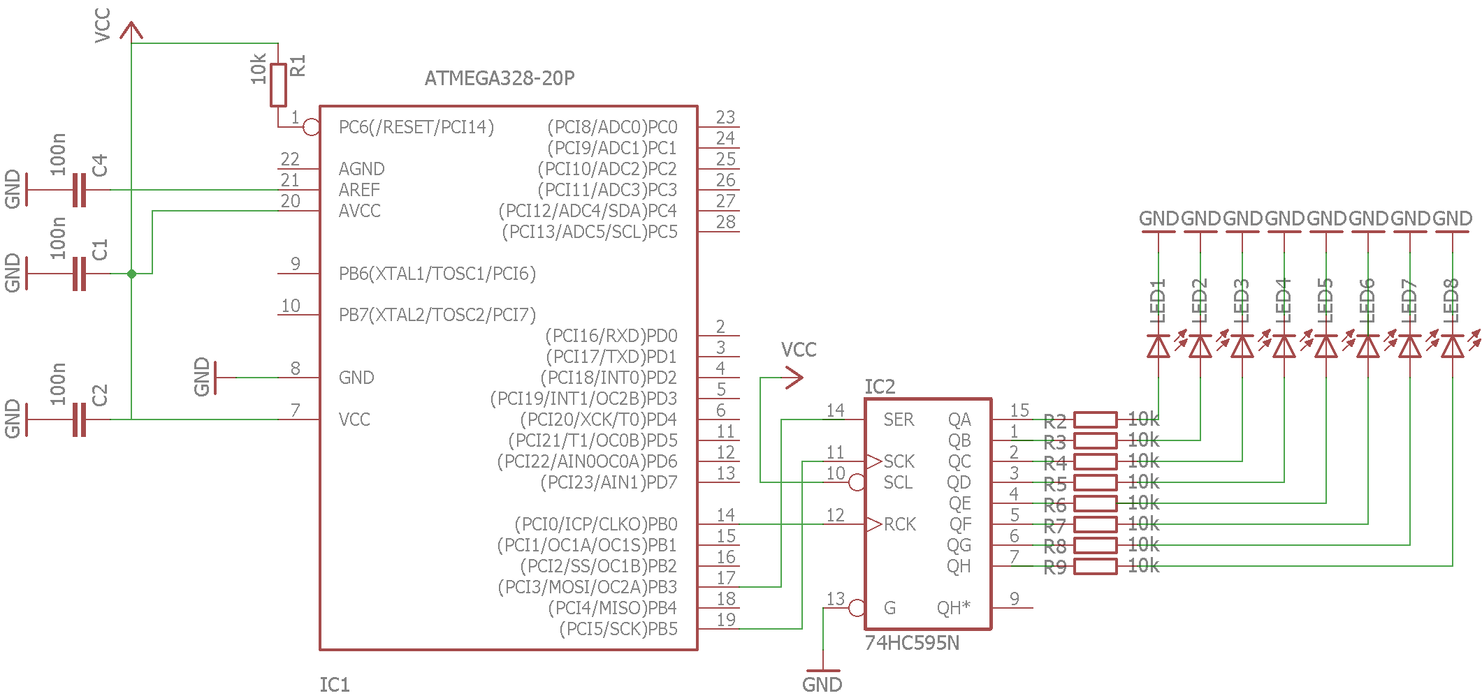 Witam, próbuje sterować diodami LED za pomocą uC ATmega328p oraz rejestru przesuwnego 74HC595, lecz diody w ogóle nie reagują (zapalają się wszystkie lub w różnych losowych kombinacjach).