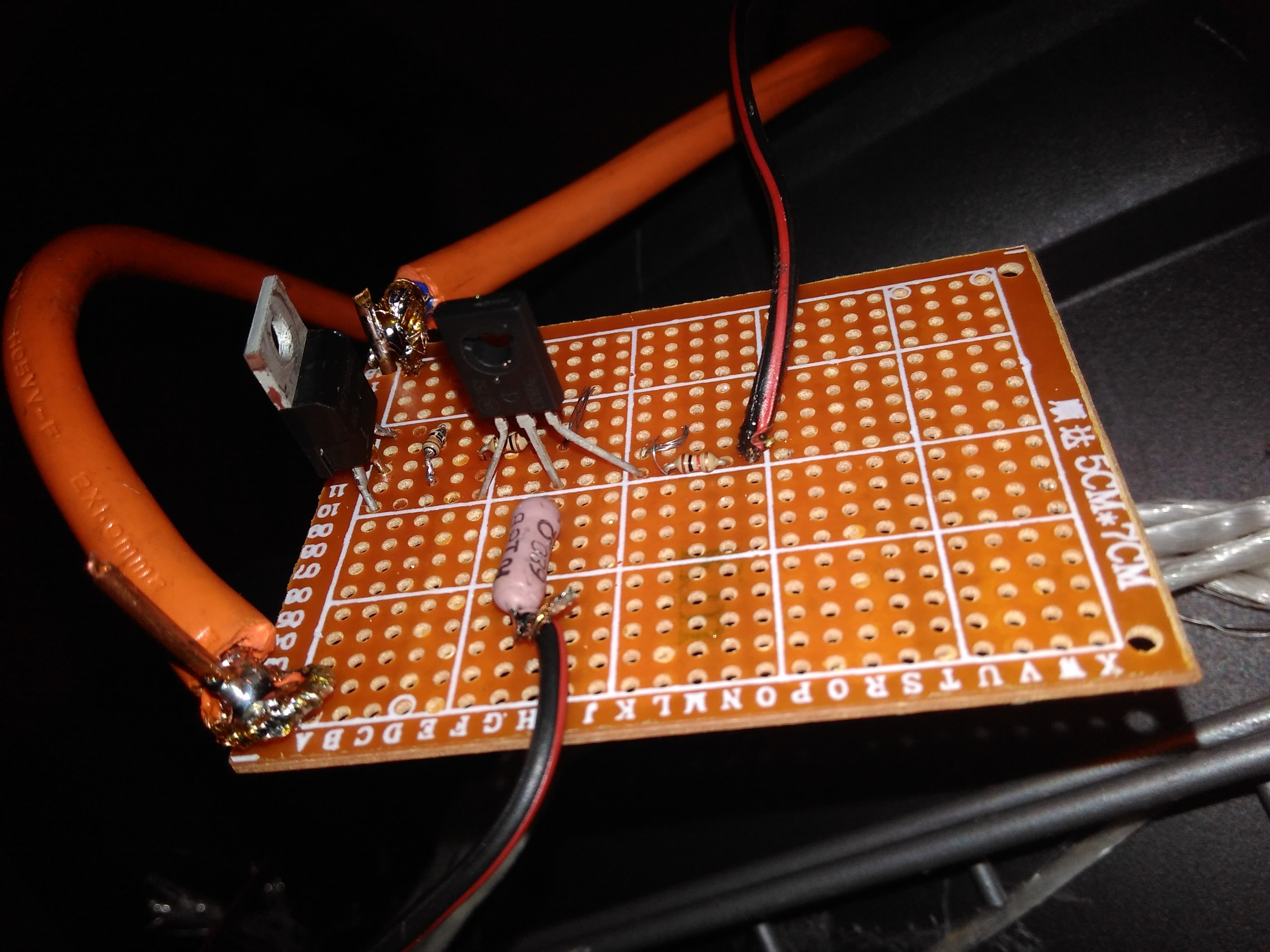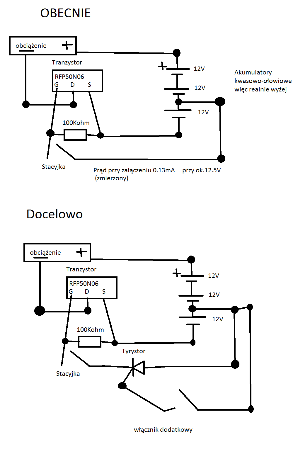 Tak wygląda układ w którym ma pracować tyrystor. Potrzebuję go jako dodatkowy przerywacz który nie pozwoli załączyć tranzystora bez wciśnięcia przycisku.