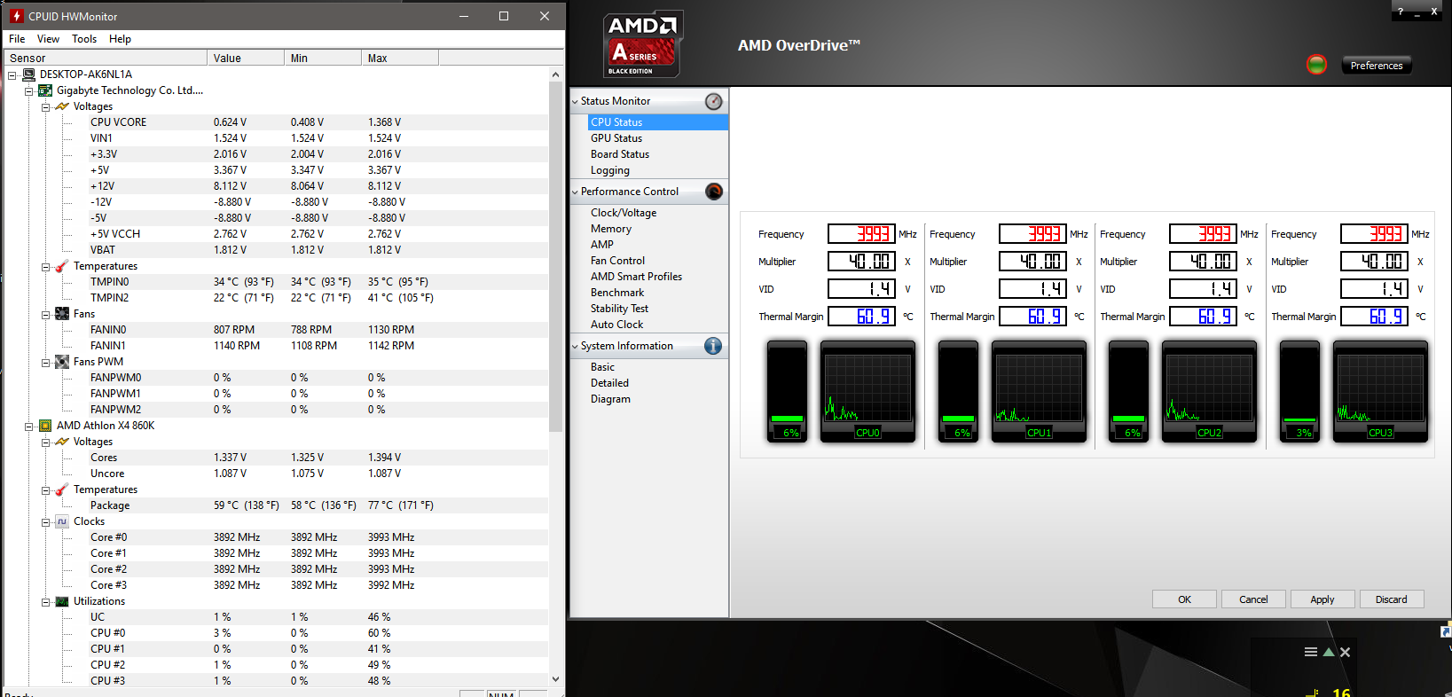 1. Po 5 minutowym teście, przy odpalonym Prime95 oraz OCCT. Temperatury mierzone HWMonitor, OCCT oraz ThermalMargin z AMD OverDrive.
