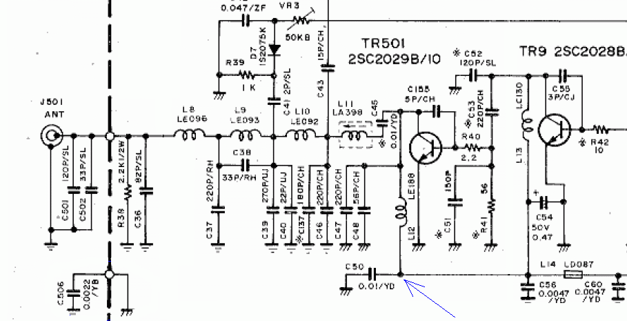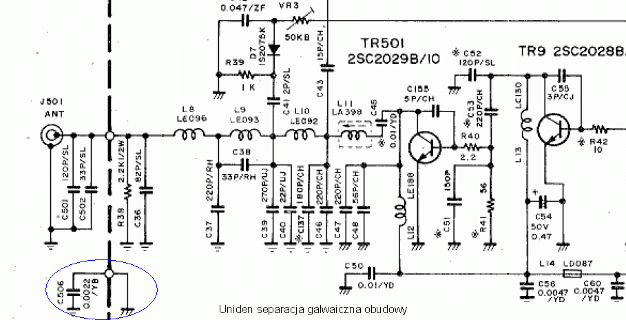 Witam. Problem polega na tym że radio nadaje z bardzo małą mocą ale modulacja jest bardzo dobra i zrozumiała. Pomiar napięć na końcówce mocy przy RX B-0,5V K-12,86V E-0V przy TX B-0,7V K-3,26V E-2,06V. Dziwne jest to że na pierwszym kanale moc jest najmniejsza a na czterdziestym największa. SWR anteny 1,1. Jaka może być tego przyczyna? Załączam schemat tego radia.