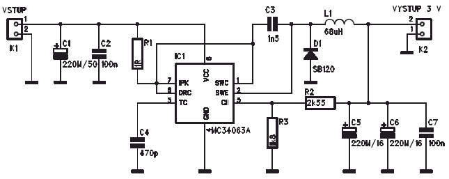 MC34063A to przetwornica napięcia DC/DC. W zaprezentowanym przypadku układ pozwala zasilać laserowe moduły 3V przy napięciu wejściowym układu od 5 do 25V. SB120 to dioda Shottkyego. Modyfikując dzielnik R2/R3 można uzyskać inne napięcia wyjściowe.