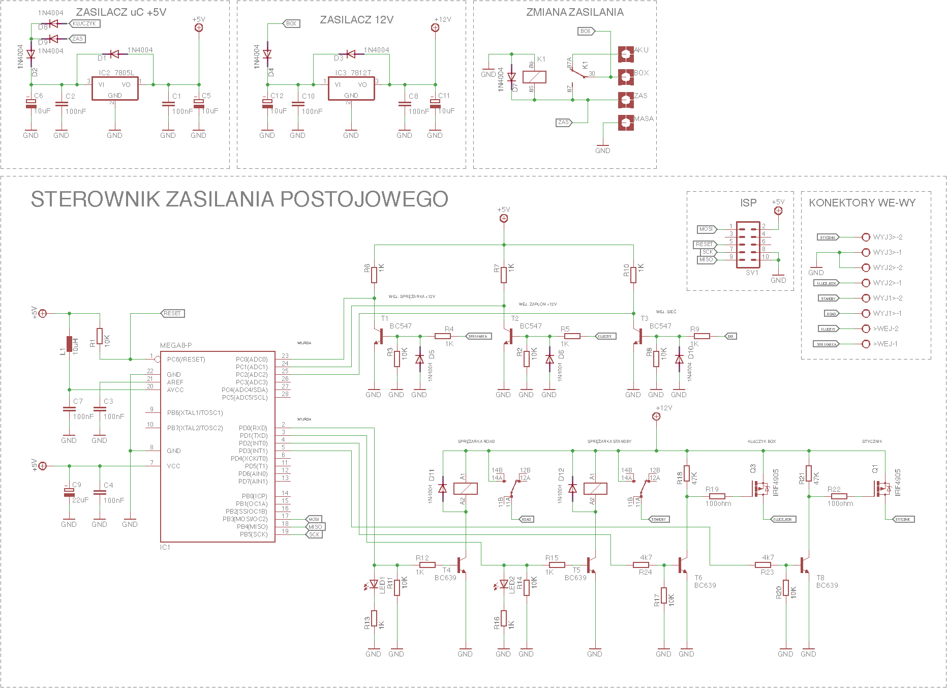 Na schemacie są dwa zasilacze 5V do zasilania mikrokontrolera i 12 V do zasilania sprężarek, podaniu do BOXu zapłonu, oraz zasilaniu cewki stycznika do silnika elektrycznego
