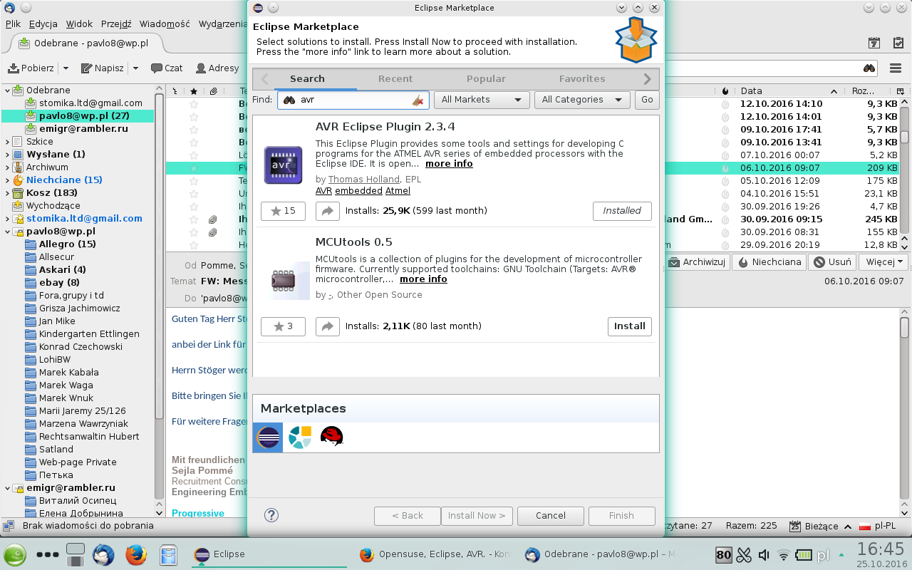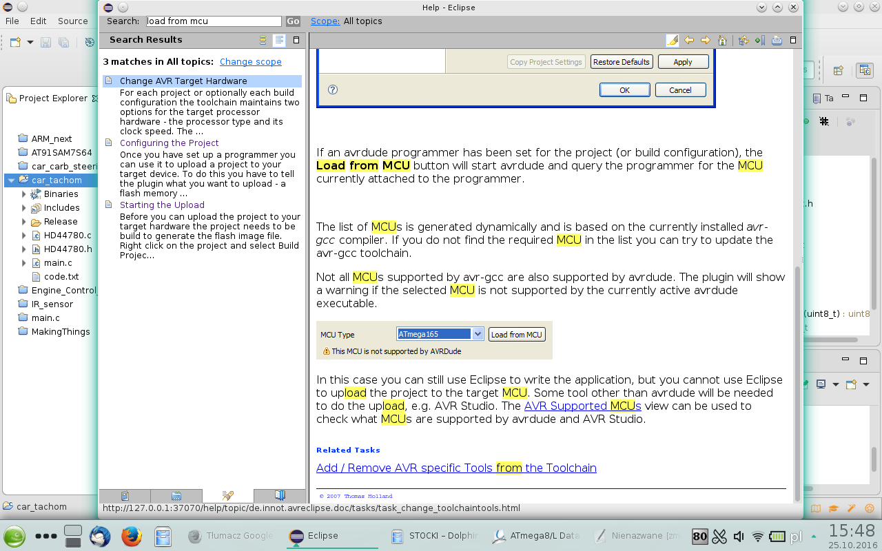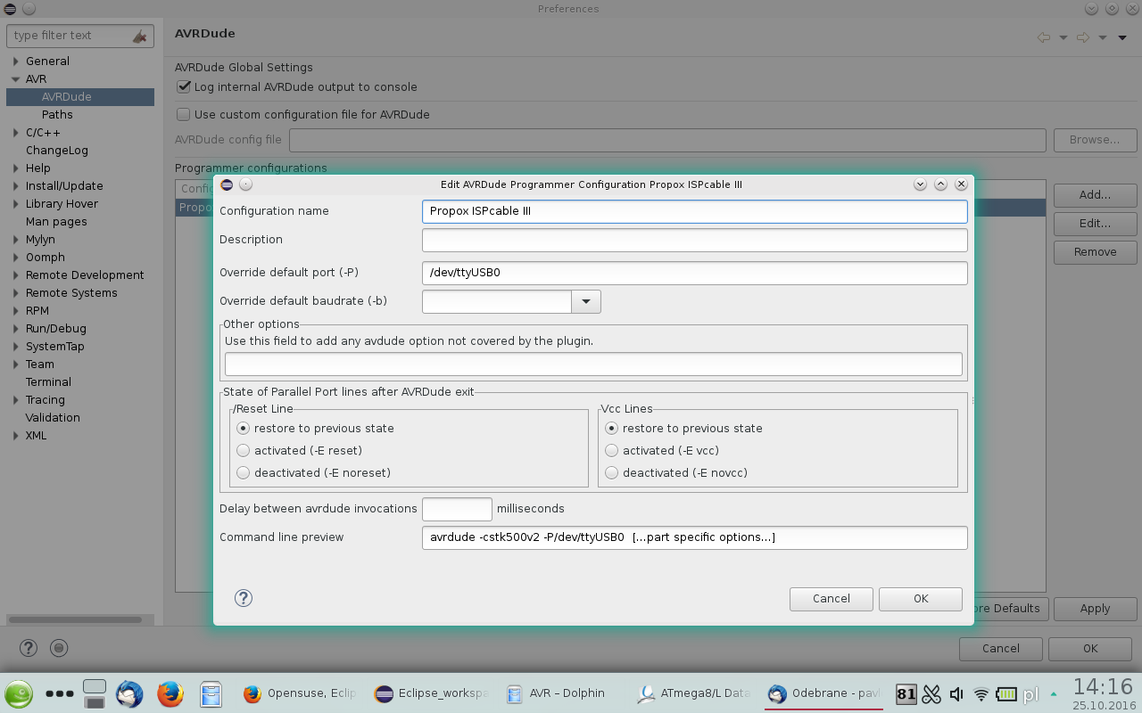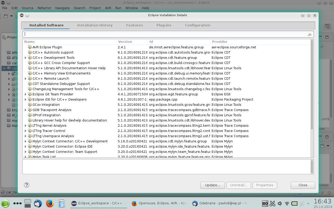 Następnie chciałem z powrotem mieć Eclipse do programowania mikrokontrolerów AVR. Pomyslałem, iż instalacja starego Eclipse Indigo mija się z celem, w związku z tym zainstalowałem Eclipse IDE for C/C++ Developers, Version: Neon.1a Release (4.6.1). Build id: 20161007-1200. Dodatkowo oczywiście AVR Eclipse Plugin 2.3.4, aktualizacja avr-gcc, cross-avr-binutils i t.d. Następnie zaimportowałem Eclipse Workspace ze starego Indigo ze wszystkimi swoimi projektami.