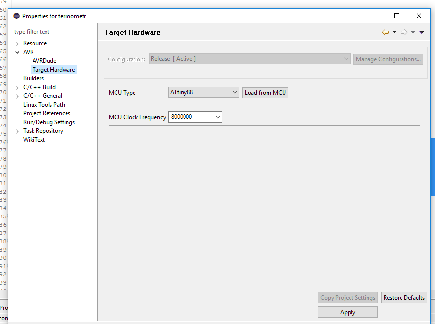 Problem: próba naciśniecia przycisku "Load from MCU" w ustawieniach projektu, "AVR" -> "Target Hardware" kończy się zawsze następująco: