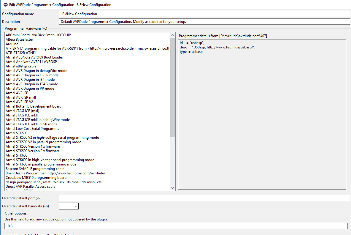 In either case check the AVRDude return message below and contact the AVR Eclipse Plugin maintainers to have this fixed.