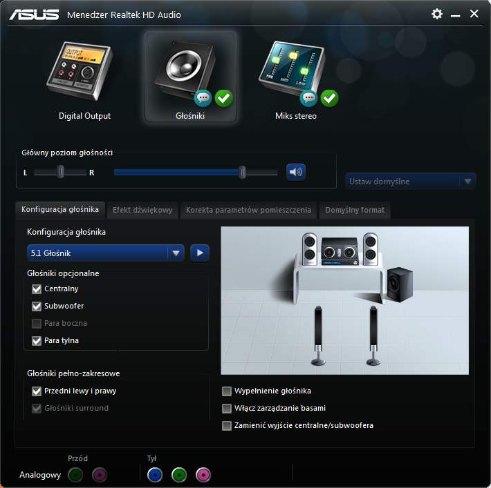 Witam, stałem się przed kilkoma chwilami szczęśliwym posiadaczem głośników Logitech X530, niestety słuchając muzyki na komputerze działają tylko dwa przednie głośniki a rolę centralnego spełnia głośnik wbudowany w monitor. W opcjach ustawione na 5.1, w teście wszystkie głośniki dają dźwięk, po zaznaczeniu opcji "wypełnienia" grają wszystkie ale z kiepską jakością. Wtyczki podłączone dobrze. Płyta główna to Asus Z97-P, najnowsze sterowniki są zainstalowane. W załączniku screen z ustawień. Bardzo proszę o pomoc