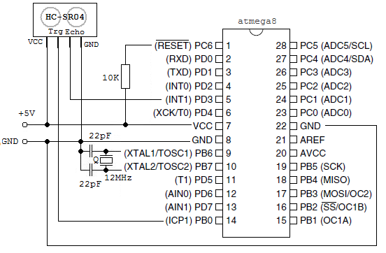 Wykorzystujesz w hc-sr04, trig i echo, a w atmega8 wszystko zależy od projektu i programu.