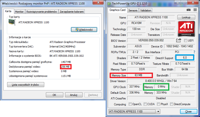 PS. Dlaczego program GPU-Z pokazuje Memory = 0 Mhz, 63 MB i DirecX 6.0 ?
