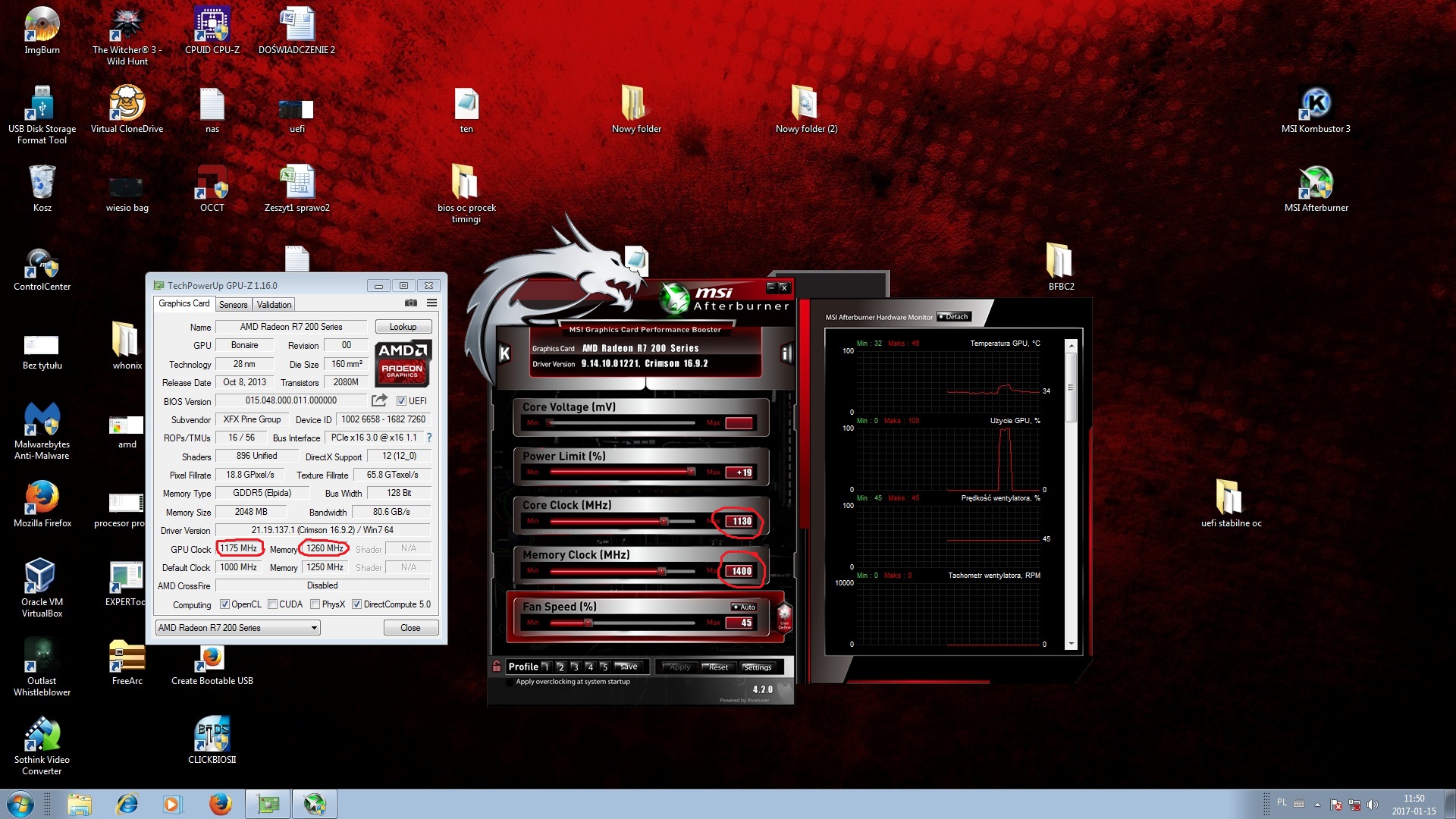 Witam. Kupiłem kartę graficzną XFX R7 260x : http://xfxforce.com/en-us/products/amd-radeon.../amd-radeon-r7-260x-core-edition-r7-260x-cnf4 . Wiadomo, dla nowszych tytułów karta może być za słaba. Postanowiłem ją podkręcić. Wtedy zauważyłem, że taktowanie zegara rdzenia wynosi 1000 MHz, a pamięci 1250 MHz. Pamięć DDR5 podczas jednego taktu przesyła 4 bity, więc 1250x4=5000MHz efektywnie, a producent podaje 6400. Podobnie rdzeń zamiast 1075MHz ma 1000 MHz. Po OC MSI Afterburner podaje mi inne wartości, a GPU-Z inne. Skąd te różnice? Czy o czymś nie wiem, czegoś nie doczytałem, czy producent mnie "oszukał"? Nawet po OC nie dałem rady uzyskać 6400 MHz efektywnej pamięci .