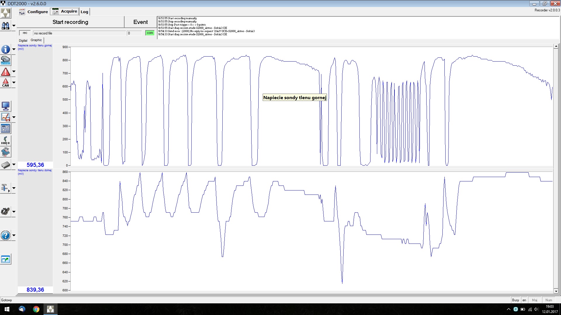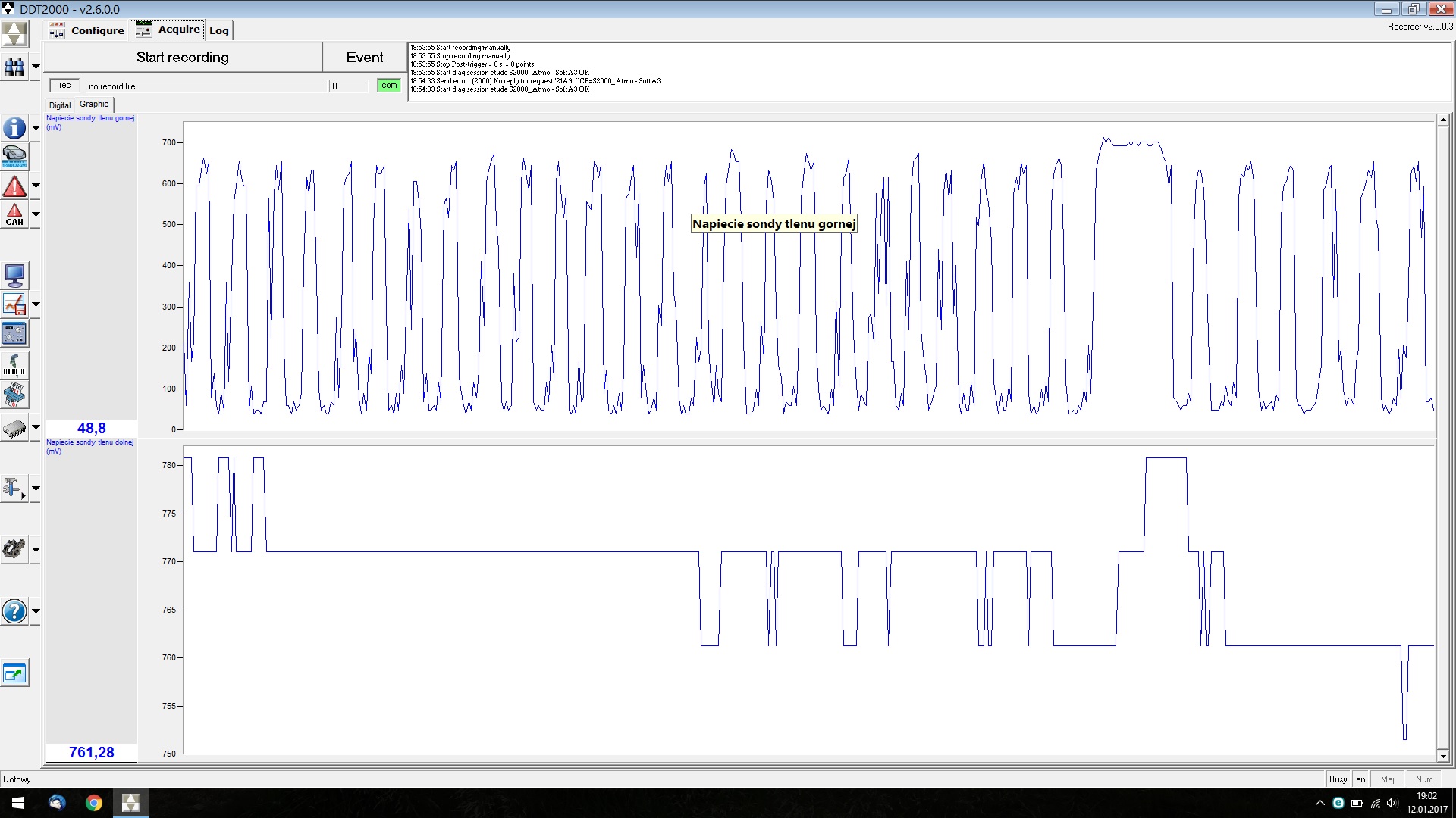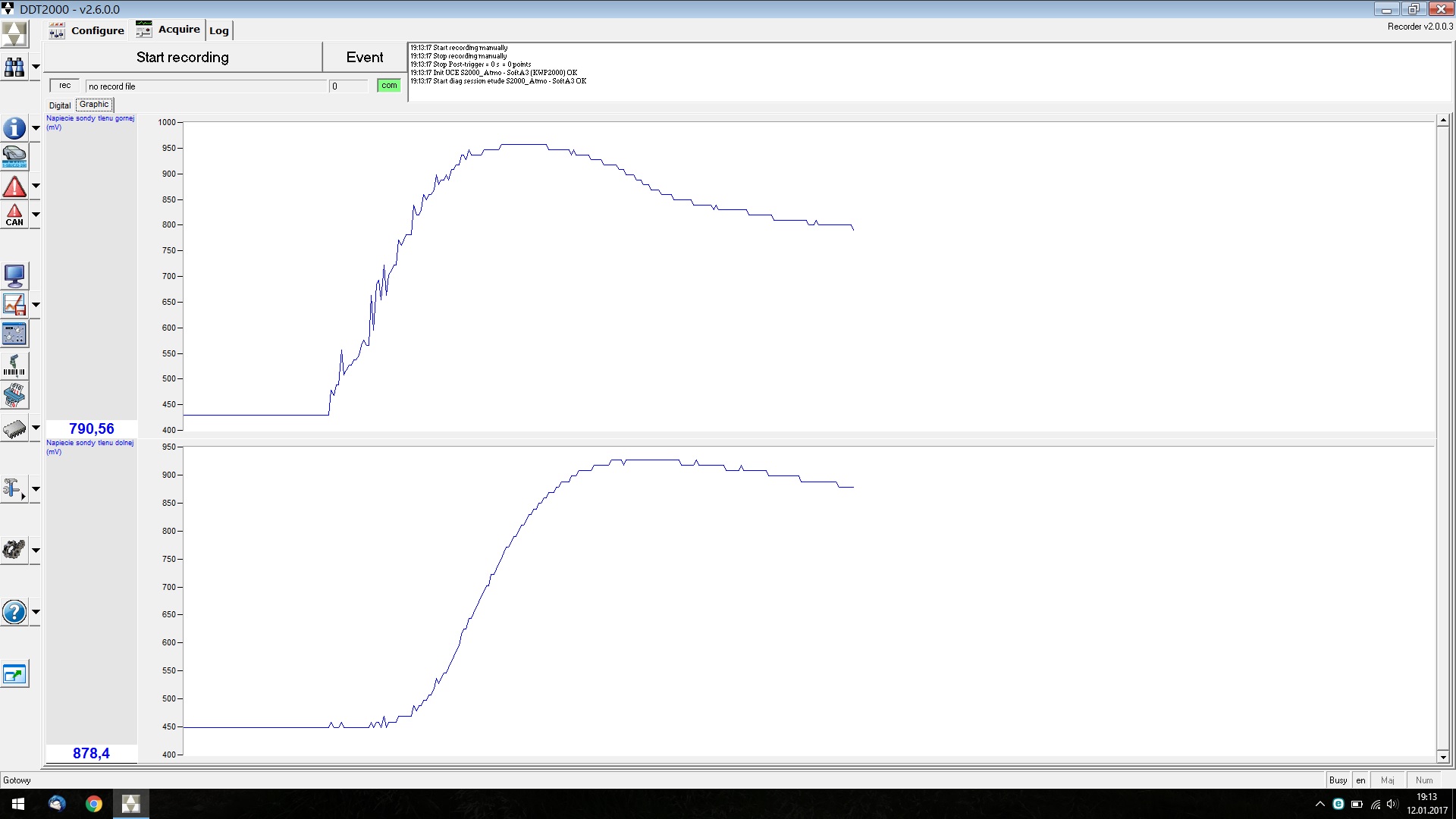 Podsumowując: w czasie jazdy i na postoju górna sonda zachowuje się prawidłowo - chyba, że się mylę, proszę mnie poprawić, sonda dolna ma w większości wskazanie w czasie jazdy i na postoju średnio około 730 mV.