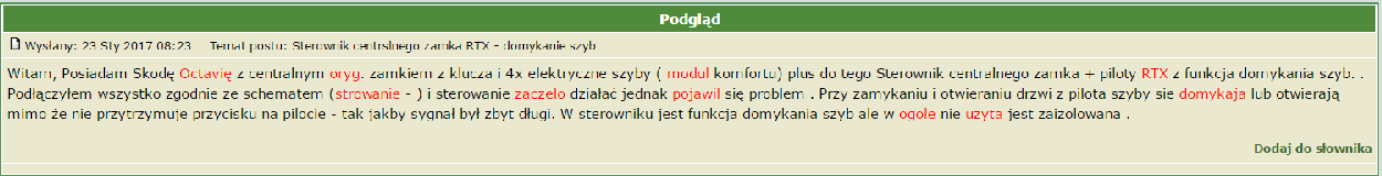 Witam, Posiadam Skodę Octavię z centralnym oryg. zamkiem z klucza i 4x elektryczne szyby ( modul komfortu) plus do tego Sterownik centralnego zamka + piloty RTX z funkcja domykania szyb. . Podłączyłem wszystko zgodnie ze schematem (strowanie - ) i sterowanie zaczelo działać jednak pojawil się problem . Przy zamykaniu i otwieraniu drzwi z pilota szyby sie domykaja lub otwierają mimo że nie przytrzymuje przycisku na pilocie - tak jakby sygnał był zbyt długi. W sterowniku jest funkcja domykania szyb ale w ogole nie uzyta jest zaizolowana .