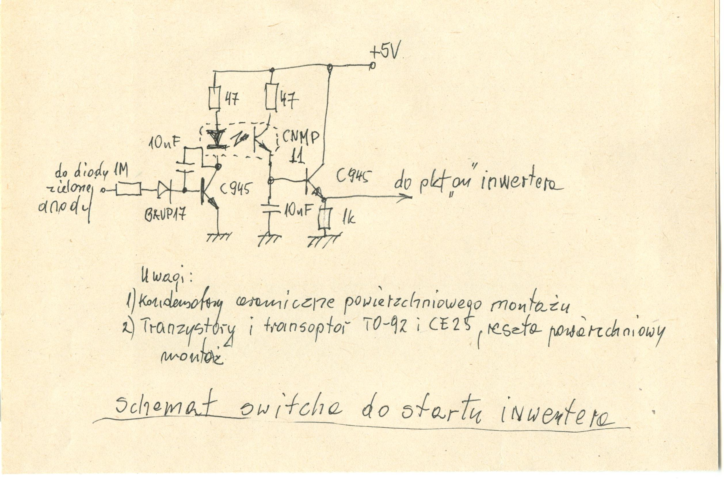 Monitor Dell załączał na około 1,5 s po czym przestawał pracować-winny jest inwerter .Schemat na elektrodzie jest dla E177PFc i posiada inne napięcia 5V,i 12V zasilające mimo że układ scalony inwertera jest taki sam TL1451 to układ inwertera jest inny.Zasilacz daje napięcia zasilające 5V i 3,3V.Wstępnie sprawdziłem tranzystory i wymieniłem układ tl1451 na nowy.Tranzystory były dobre a wymiana nie dała pozytywnego skutku.Do załączenia inwertera służy górny zewnętrzny pin przyłącza do regulacji jasności stojący obok wewnętrzny pin.Musiałem przerwać te połączenia bo sygnały z µP nie sterowały tego inwertera.Wykonałem układ "switch"(rysunek poniżej),który z anody diody zielonej w panelu z przyciskami w momencie załączenia włącza inwerter.W monitorze przy układzie przycisków nie ma miejsca więc połączenia dokonałem z złącza taśmy łączącej płytkę przycisków na płytce monitora to jest 3 od dołu kołek złącza.(wymaga małej lutownicy i precyzji)Inwerter był załączany ,ale nie pracował długo -wyłączał świetlówki .Po stwierdzeniu że na 15 nóżce układu tl1451 jest napięcie przekraczające napięcie blokujące 60mV dołączyłem opornik powierzchniowego montażu 3k do masy,po czym napięcie zmalało do około 30mV-inwerter pracował ciągle.Regulacji jasności dokonałem przy pomocy potencjometru montażowego 22k,który przykleiłem z tyłu ,monitora podłączając suwak do wewnętrznego pina przyłącza zasilacza inwertera ,lewy do masy ,a prawy do +5V Jasność dała się regulować ,ustawiłem wartość prawie maksymalną .Całość zmontowałem .Monitor pracuje poprawnie.