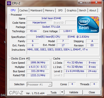 Dziś zamontowałem używany procesor Intel Xeon E5440 2.83 Ghz, zainstalowałem go w swojej płycie głównej Gigabyte GA-EG31MF-S2 rev.2.0 , jest to modyfikacja LGA771 --> LGA775 , o dziwo wszystko ruszyło od kopa bez wgrywania nowych sterowników biosu , wszystko łądnie pięknie tylko zastanawia mnie dlaczego w programie CPU-Z w zaznaczonym na czerwono polu poniżej pokazuje mniejsze taktowanie niż powinien miec. Zaznaczam że wartość nie podnosi sie wraz z obciążeniem