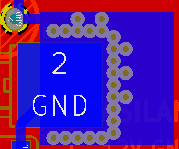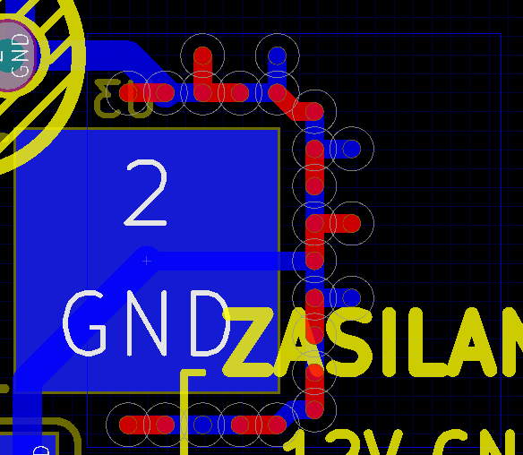 Mam dwie warstwy, dolna w całości masowa. Na górnej w kilku miejscach mam zamknięte obwody ścieżek, przez co masa na tej warstwie wewnątrz tych pól się nie rozlewa (elementy SMT, więc między wyprowadzeniami też nic się nie "przeleje"). Chciałem prosto wstawić przelotki, żeby "pożyczyć" sygnał masowy z warstwy dolnej, ale nie widzę nigdzie opcji przypisania do przelotki atrybutu sygnału GND.