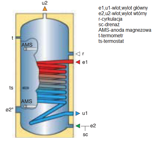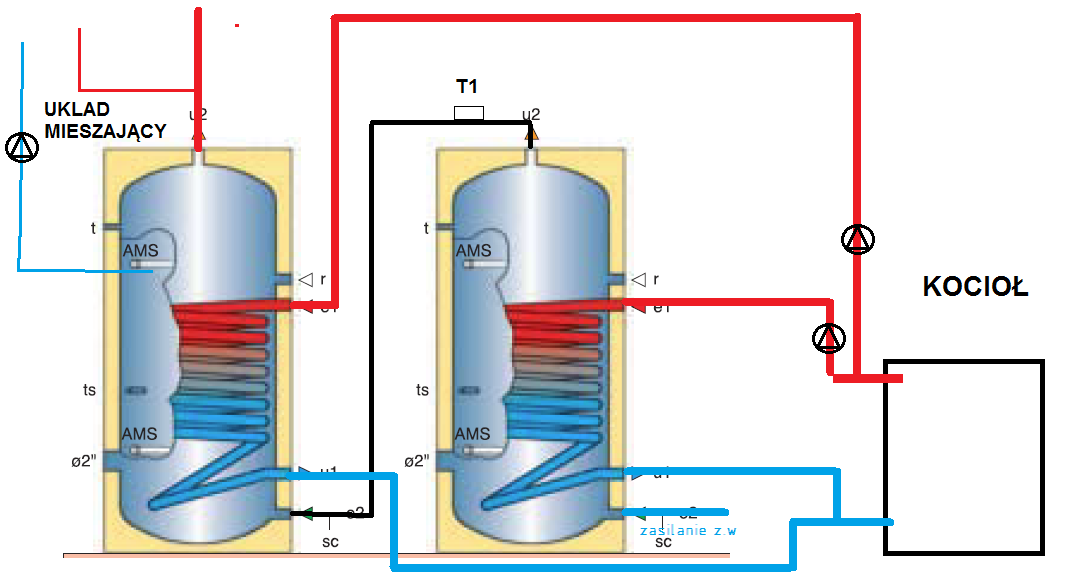 Mam w domu wielorodzinnym następujące podłączenie podgrzewaczy cwu. Z moich obserwacji wynika że woda w kranie czasem jest za zimna. Rury z wodą zasilającą wymienniki i powracającą do kotła mają zbliżoną temperaturę (bardzo ciepłe/gorące). Woda wychodząca do układu jest letnia (zwłaszcza po dłuższym nie pobieraniu wody (np. rano). Dodam, że schemat narysowałem na rysunku kotła z ulotki producenta. W naszym podłączeniu oryginalne wyjścia oznaczone t, fi2", r są zaślepione. Termostat ts w lewym podgrzewaczu zamontowany w prawym zaślepiony. Czujnik temperatury T1 podłączony do sterowania pompami ustawiony na 50 stC wskazuje max 48-49 stC, W wyniku czego pompy cały czas pracują (nawet w nocy gdy uklad mieszający jest wyłączony). Temperatura kotła waha się od 55-70 stC.