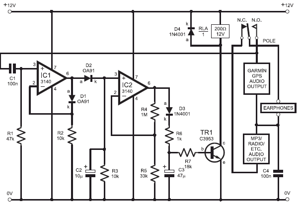 Zadanie polegało na wykonaniu urządzenia, które będzie doprowadzało sygnał bezstratnie do wzmacniacza przez cały okresu czasu dopóki nie pojawi się drugi sygnał audio. W momencie nadejścia drugiego sygnału audio, wejście wzmacniacza musi zostać na ten sygnał przełączone. Urządzenie miało zostać wykorzystane w samochodzie lub motorze zaopatrzonym w odtwarzacz mp3 i odbiornik GPS z komunikatami słownymi. Przy normalnej pracy do wzmacniacza doprowadzany był sygnał z odtwarzacza mp3. W momencie nadejścia komunikatu słownego (poprzedzonego sygnałem beep) układ dokonuje wykrycia drugiego sygnału i przełącza sygnały za pomocą przekaźnika. W ten sposób muzyka ucicha a słychać komunikat słowny z GPS. Ważne okazało się wprowadzenie opóźnień kilkusekundowych wyłączenia przekaźnika - to na wypadek przerwy między wyrazami. TR1 można zastosować dowolny niskoprądowy tranzystor npn. D1, D2 to diody germanowe.
