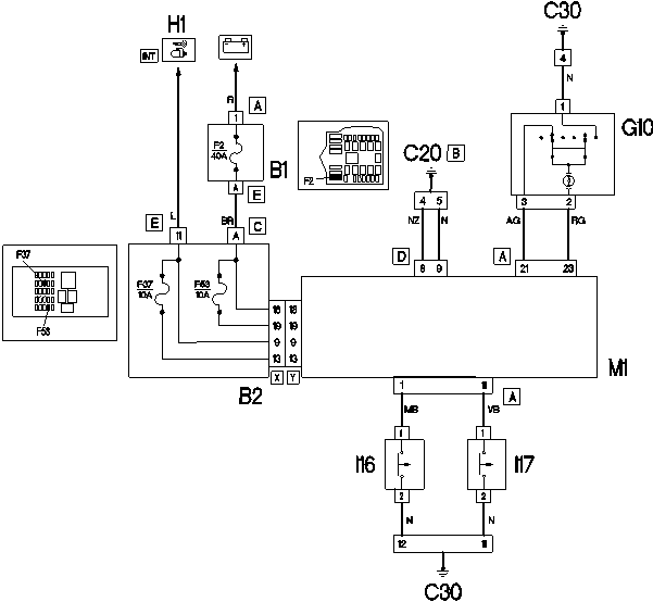 Na schemacie też nie ma niespodzianek.N50 - drzwi lewe przednie i ów włącznik - jest bezpośrednio podłączony do M1 - komputera - a ten do E50 - licznika.