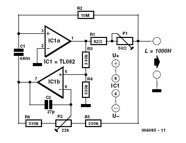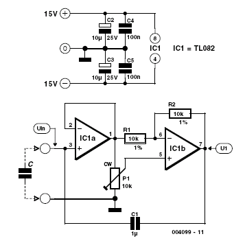 Pierwszy układ jest symulatorem pojemności w zakresie od 0-2uF . Wzmocnienie IC1b może być regulowane za pomocą P1.
