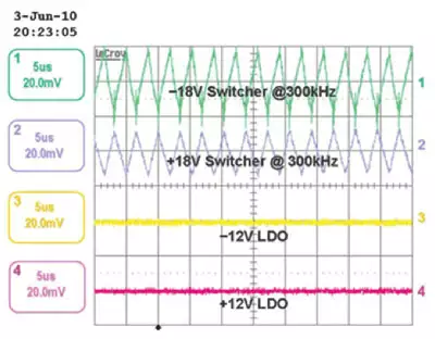 LDO zastosowany w tym układzie charakteryzuje się wysokim PSRR, więc jest bardzo dobry w usuwaniu tętnień napięcia, co oznacza, że nie występuje potrzeba stosowania np. filtra LC za przetwornicą. Istotnie zmniejsza to wielkość, koszt i poziom skomplikowania systemu. Na rysunku 5 pokazano oscylogram przed i za LDO, który pokazuje, jak dobrze filtrowany jest szum z zasilania, pochodzącego z sprawnej przetwornicy impulsowej.