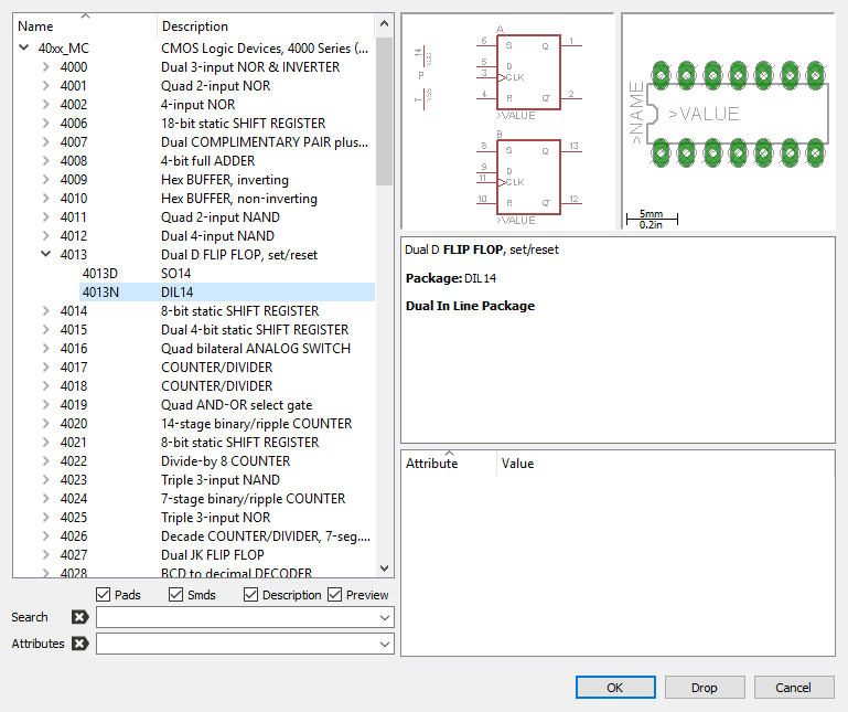 Postanowiłem podejrzeć, jak ma się sytuacja w gotowych komponentach. Dla przykładu otworzyłem bibliotekę układu 4013:
